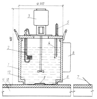 1 - сосуд цилиндрической формы; 2 - электронагреватель трубчатый; 3 - электромешалка; 4, 7 - термопары; 5 - электроконтактный термометр; 6 - блок управления; 8 - дно из полиэтиленовой или поливинилхлоридной пленки; 9 - тепломер (измеритель теплового потока); 10 - испытуемый образец; 11 - бетонная плита; 12 - дистиллированная вода 2.2. Прибор состоит из: сосуда из органического стекла диаметром 200 мм с дном из полиэтиленовой или полиамидной пленки толщиной 0,1 мм; трубчатого электронагревателя (ТЭН) мощностью 500 - 2000 Вт; электромешалки (мощность электродвигателя 20 - 60 Вт, частота вращения 1300 - 2600 об/мин); электроконтактного термометра по ГОСТ 9871-75; терморегулятора; двух стандартных хромель-алюмелевых (ТХА) или хромель-копелевых (ТХК) термопар по ГОСТ 6616-74 (градуировка по ГОСТ 3044-77), соединенных последовательно так, чтобы образовать дифференциальную термопару (допускается применение нестандартных медь-константановых термопар при условии их индивидуальной градуировки в установленном порядке). Измерителя теплового потока (тепломера) ИТП-11 по ГОСТ 25380-82, толщиной не более 1,5 мм. Для термостатирования воды допускается использовать в качестве устройства серийный блок терморегулирования от жидкостного термостата СЖМЛ-19/2,5-И1. 2.2.1. В сосуд заливают