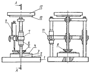 1 - основание; 2 - столик; 3 - шток; 4 - образец; 5 - опорная пластина; 6 - втулка, 7 - траверса; 8 - наконечник; 9 - индикатор часового типа; 10 - тарелка; 11 - стопорный винт; 12 - груз Приспособление для определения площади контакта молотка ударной машины с поверхностью образца