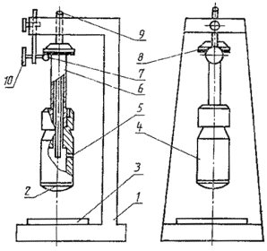 1 - станина; 2 - наконечник молотка; 3 - образец; 4 - молоток; 5 - выпускное отверстие; 6 - золотник; 7 - кулачок фиксатора; 8 - резиновая прокладка; 9 - направляющий стержень; 10 - фиксатор 4. ПОДГОТОВКА К ИСПЫТАНИЯМ4.1. Перед началом