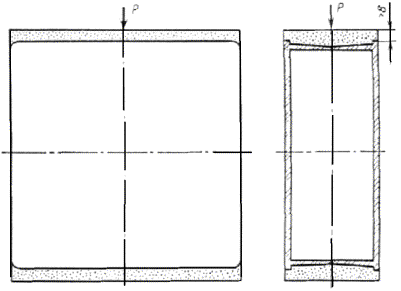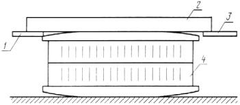 1 - угловая плита; 2 - блок; 3 - щуп; 4 - поверочная плита Блок устанавливают торцовой поверхностью на горизонтальную поверочную плиту по ГОСТ 10905-86 и прижимают его к угловой плите, изготовленной по чертежам, утвержденным в установленном порядке. Зазор между торцовой поверхностью блока и поверхностью поверочной плиты измеряют щупом ТУ 2-034-225-87 (или металлической пластиной, изготовленной по чертежам, утвержденным в установленном порядке). Затем блок поворачивают на 90° и проводят те же измерения. Величина зазора не должна превышать величины, указанной в п. 2.7. 4.7. Показатели внешнего вида (пороки) блоков определяют визуально в проходящем свете при рассеянном освещении на расстоянии 0,8 - 1,0 м. Освещенность на контролируемой поверхности блока должна быть 100 - 120 лк. Пороки измеряют металлической линейкой по ГОСТ 427-75 с погрешностью до 1 мм. За размер порока принимают наибольший результат измерения. Цвет (оттенок) и вид рельефного узора блоков проверяют путем сравнения с образцами-эталонами. (Измененная редакция, Изм. № 1). 4.8. Коэффициент светопропускания стекла, применяемого для изготовления неокрашенных блоков, определяют по ГОСТ 11-78 на плоских пластинах, полированных с обеих сторон. 4.9. Внутренние напряжения в неокрашенных блоках определяют по СТ СЭВ 2052-79. 4.10. Термостойкость блоков определяют по ГОСТ 25535-82. (Измененная редакция, Изм. № 1). 4.10.1 - 4.10.3. (Исключены, Изм. № 1). 4.11. Герметичность блоков проверяют после проведения испытания на термостойкость по п. 4.10. После выдержки в ванне с водой не менее 5 мин блоки вынимают, высушивают и проверяют наличие влаги во внутренней полости. (Измененная редакция, Изм. № 1). 4.12. Определение предела прочности при сжатии 4.12.1. Сущность метода заключается в разрушении блока равномерно распределенной нагрузкой, прикладываемой к двум его противоположным торцовым поверхностям. 4.12.2. Аппаратура и принадлежности Пресс гидравлический по ГОСТ 8905-82. Металлическая форма для обетонирования блока. 4.12.3. Подготовка образцов У блоков, отобранных для испытания в соответствии с п. 3.5, измеряют в двух местах длину и ширину и по средним арифметическим значениям вычисляют площадь торцовой поверхности блока, находящейся под нагрузкой. Две противоположные торцовые поверхности блока покрывают обмазкой из цементного раствора так, чтобы они были ровными. Обмазка должна выступать за лицевые поверхности блока не менее чем на 8 мм (черт. 3).