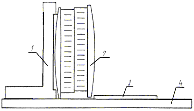 3.6. При получении неудовлетворительных результатов испытаний блоков, отобранных в соответствии с п. 3.5, по водостойкости, коэффициенту светопропускания стекла и пределу прочности при сжатии проводят повторные испытания по этому показателю удвоенного числа блоков из той же партии. При неудовлетворительных результатах повторных испытаний партия блоков приемке не подлежит. 3.5, 3.6. (Измененная редакция, Изм. № 1). 3.7. Потребитель имеет право производить контрольную проверку соответствия блоков требованиям настоящего стандарта, соблюдая при этом приведенный порядок отбора образцов и применяя указанные методы испытаний. 4. МЕТОДЫ ИСПЫТАНИЙ4.1. Длину, ширину и толщину блоков измеряют металлической рулеткой по ГОСТ 7502-89 с погрешностью до 1 мм. Результаты каждого измерения длины, ширины и толщины блоков должны находиться в пределах допускаемых отклонений. 4.2. Массу блоков определяют взвешиванием на весах по ГОСТ 23676-79 с погрешностью до 0,01 кг. Результаты каждого взвешивания должны находиться в пределах допускаемых отклонений. 4.3. Толщину лицевых стенок блоков измеряют стенкомером типа С-50 по ГОСТ 11358-89 с удлинителем или другим измерительным инструментом, изготовленным по чертежам, утвержденным в установленном порядке. Измерение толщины стенок производят на полублоках в зоне пересечения диагоналей лицевой поверхности полублока. Диаметр зоны измерений должен быть 50 - 70 мм. Производят не менее трех измерений. Результат каждого измерения не должен быть менее указанного в п. 2.4. При измерении толщины лицевых стенок с рельефным узором высоту рельефа не включают в номинальную толщину. 4.4. Выпуклость наружных поверхностей лицевых стенок блоков определяют двумя щупами (или металлическими пластинами толщиной, соответствующей выпуклости наружных поверхностей лицевых стенок блоков, указанной в п. 2.5, изготовленными по чертежам, утвержденным в установленном порядке) в соответствии с черт. 1. 1 - щуп первый; 2 - поверочная линейка; 3 - щуп второй; 4 - блок Черт. 1 Один щуп вставляют под поверочную линейку, приложенную к контролируемой поверхности блока. При этом второй щуп не должен входить в зазор с противоположной стороны между поверочной линейкой и поверхностью блока. Вогнутость наружных поверхностей лицевых стенок блоков определяют измерением щупом ТУ 2-034-225-87 (или металлической пластиной толщиной, соответствующей вогнутости наружных поверхностей лицевых стенок блоков, указанной в п. 2.5, изготовленной по чертежам, утвержденным в установленном порядке) наибольшего просвета, образующегося при наложении поверочной металлической линейки на эти поверхности. Выпуклость и вогнутость поверхностей лицевых стенок блоков определяют в двух взаимно перпендикулярных направлениях. 4.5. Наличие выступающего за пределы внешних габаритов блока сварного шва проверяют прикладыванием поверочной металлической линейки по ГОСТ 8026-75 к торцовым поверхностям блока перпендикулярно поверхностям лицевых стенок и перемещением ее вдоль ребер блока. Продольное покачивание линейки не допускается. 4.6. Смещение полублоков определяют в соответствии с черт. 2.