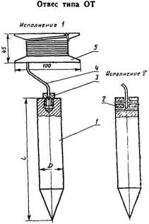 Примечание. В таблице указана масса отвеса и его головки. Пример условного обозначения отвеса типоразмера ОТ50, исполнения 1: Отвес ОТ50-1 ГОСТ 7948-80