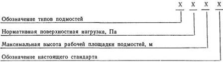 Примечание. В обоснованных случаях по согласованию с базовой организацией по стандартизации средств подмащивания допускается изготовление подмостей с иными параметрами и размерами. 1.2.2. Устанавливается следующая структура условного обозначения подмостей.
