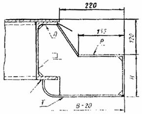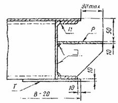 отклонения размеров: отверстий - H14, валов - h14, остальных - ± 7.2.6. На поверхности каждого колеса должно быть нанесено его условное обозначение, состоящее из значения диаметра поверхности катания колеса и обозначения настоящего стандарта. Примечание. Маркировку колес допускается не производить при изготовлении и установке их в поддонах предприятием-изготовителем. 7.2.7. Устройства для перемещения форм по рольгангу выполняют в виде направляющих толщиной не менее 10 мм, шириной не менее 70 мм, изготавливаемых из полосовой стали по ГОСТ 103-76 или листовой стали по ГОСТ 19903-74 или из квадрата не менее 40´40 мм по ГОСТ 2591-71 (черт. 8). Направляющие приваривают к нижней поверхности балок каркаса прерывистым швом H1-УП-D5-100/500 по ГОСТ 14771-76. Сварные швы необходимо располагать с обеих сторон направляющей в шахматном порядке. Допускается сварные швы выполнять по ГОСТ 5264-80. 7.2.8. Элементы поддона, взаимодействующие с автоматическим захватом, выполняют в виде кронштейнов, располагаемых по продольным сторонам поддона. Примеры конструкции и размеров элементов опорных кронштейнов для поддонов, применяемых при поточно-агрегатном и полуконвейерном способах производства изделий, приведены на черт. 9 и 10. В технически обоснованных случаях допускается применение опорных кронштейнов других конструкций. Примечание. Размер H не должен быть менее 140 мм и определяется расчетом из условия прочности кронштейна.