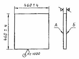 Черт. 11 Углы плиты допускается выполнять радиусом, равным 12 мм. В технически обоснованных случаях допускается изготавливать плиты круглой или прямоугольной формы. При этом диаметр круглой плиты или меньшая сторона прямоугольной плиты должна быть не менее (460±4) мм. 9.2. Поверхности А и Б плиты допускается обрабатывать механическим способом. При этом шероховатость поверхности должна быть не более Ra 20 мкм по ГОСТ 2789-73. 9.3. Примеры установки плит на раме поддона и места наложения сварных швов приведены в рекомендуемом приложении 5. 9.4. Приварку плит следует производить к элементам каркаса сварным швом с катетом не менее 8 мм по ГОСТ 14771-76. Допускается швы выполнять по ГОСТ 5264-80. 10. Требования к конструкции фиксаторов 10.1 и 10.1.1 (Исключены, Изм. №1). 10.2. Типы, конструкция и размеры фиксаторов закладных деталей и опорного платика, а также примеры применения фиксаторов и платика приведены на черт. 1 - 7 и в таблице рекомендуемого приложения 7. Неуказанные предельные