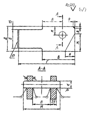 В - расстояние между направляющими поверхностями стоек пакетировщика; П - поверхность, взаимодействующая с крюком автоматического захвата; Р - опорная поверхность для стойки автоматического захвата; Т - поверхность, опирающаяся на кронштейн пакетировщика 7.2.9. Места наложения сварных швов показаны на черт. 9 и 10. Сварные швы следует выполнять по ГОСТ 14771-76 и ГОСТ 23518-79. Допускается швы выполнять по ГОСТ 5264-80 и ГОСТ 11534-75. Параметры сварных швов определяют расчетом. 8. Требования к конструкции упоров для натяжения предварительно напрягаемой арматурной стали 8.1. Требования к конструкции опорных устройств для натяжения предварительно напрягаемой арматуры механическим, электротермическим или электротермомеханическим способом определяют в зависимости от схемы армирования изделий и конструкции формы. 8.2. Примеры конструкции вилочных упоров при электротермическом способе натяжения арматурной стали приведены на черт. 1 - 4 рекомендуемого приложения 4. 8.3. Размеры упоров и толщину съемных пластин определяют расчетом в зависимости от диаметра и количества предварительно напрягаемой арматурной стали по ГОСТ 5781-82, а также от величины ее натяжения. 8.4. Места наложения сварных швов показаны на черт. 1 - 4 рекомендуемого приложения 4. Сварные швы следует выполнять по ГОСТ 14771-76 и ГОСТ 23518-79. Допускается швы выполнять по ГОСТ 11534-75 и ГОСТ 5264-80. Параметры сварных швов определяют расчетом. 8.5. Упоры, показанные на черт. 1 - 3 рекомендуемого приложения 4, должны быть оснащены съемными пластинами, предназначаемыми для опирания временных анкеров напрягаемой арматурной стали или зажимов по ГОСТ 23117-78. 8.6. Глубина пазов упоров должна быть не менее двух диаметров напрягаемой арматуры, а ширина - на 2 - 3 мм превышать максимальный, с учетом допуска, диаметр арматуры, размещаемой в упорах. 8.7. Съемные пластины должны иметь паз, ширина которого на 2 - 3 мм превышает максимальный, с учетом допуска, диаметр размещаемой в пластинах арматуры. 8.8. По контуру паза в съемной пластине с внешней стороны должна быть выполнена фаска размером 5´45° в случае натяжения стержней с высаженными головками. При изготовлении съемных пластин способом штамповки допускается фаску выполнять размером 2´45°, а также в случае натяжения стержней опрессованными обоймами, шайбами или закрепления зажимами по ГОСТ 23117-78. 8.9. Шероховатость опорных поверхностей упоров, съемных пластин должна быть не грубее Ra 25 мкм, а поверхностей по контуру пазов в съемной пластине и упоре - не грубее Ra 50 мкм по ГОСТ 2789-73. 8.8 и 8.9 (Измененная редакция, Изм. № 1). 9. Требования к конструкции плиты для крепления форм 9.1. Конструкция и размеры плит для электромагнитного крепления формы к виброплощадке должны соответствовать указанным на черт. 11.