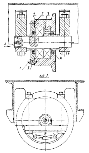 1 - колесо; 2 - прокладка; 3 - подшипник 315 пли 316 по ГОСТ 8338-75; 4 - манжета 2.1-90´120-1 или 2.1-95´120-1 по ГОСТ 8752-79; 5 - крышка; 6 - болт 3М 12´30.58 по ГОСТ 7798-70 Черт. 2