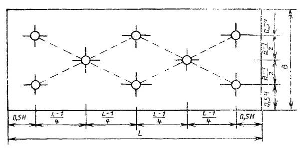 где m - масса партии, т; Qm - производительность потока глины, т/ч; n - количество точечных проб. 5.3 Первую точечную пробу отбирают произвольно в любой момент времени, далее сохраняя период отбора, определенный по 5.2. Отбор проб вручную производят от песка в неподвижном слое, а также в процессе перегрузки. 5.4 Отбор проб из неподвижного слоя производят с помощью щупа или совка. Расположение точек отбора указано на рисунке 1. Рисунок 1 5.5 При погрузке и разгрузке глины с помощью цикличнодействующих механизмов точечные пробы отбирают на вновь образованной поверхности в месте взятия или высыпания глины погрузочным механизмом. Количество опробуемых ковшей или грейферов должно быть не менее установленного числа точечных проб. Интервал Т, выраженный числом рабочих циклов, через которые следует отбирать точечные пробы, вычисляют по формуле