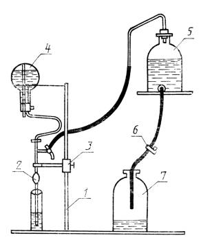 Примечание. Плотность глины принимают равной 2650 кг/м3. 4.3. Отбор суспензии производят. Пробу отбирают пипеточным прибором следующим образом (см. чертеж) соединяют аспиратор с пипеткой, ослабляют зажим для постоянного медленного слива воды из аспиратора. С помощью упора устанавливают глубину погружения пипетки в цилиндр. Глубину взятия проб определяют в зависимости от размера частиц фракций по табл. 1. Пипетку вводят в цилиндр на установленную глубину, открывают кран аспиратора и засасывают в пипетку суспензию в количестве 25 см3. Кран аспиратора и зажим на сливной трубке закрывают. Продолжительность отбора суспензии в зависимости от размера фракции должна быть: менее 0,01 мм - 30 с; менее 0,005 мм - 25 с; менее 0,001 мм - 30 с. Прибор для отбора суспензии