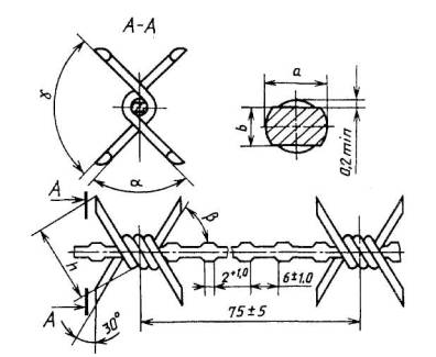 Дата введения 01.07.70 Настоящий стандарт распространяется на колючую проволоку, состоящую из одной рифленой пряди (основы) с расположенными на ней на равных расстояниях друг от друга шипами. Содержание 1. ОСНОВНЫЕ ПАРАМЕТРЫ И РАЗМЕРЫ1.1. Проволоку изготовляют по виду поверхности: без покрытия - К; оцинкованную - КЦ (1, 2, 3 и 4 классов); оцинкованную пассивированную - КЦП; по точности изготовления: повышенной точности - А; нормальной точности. (Измененная редакция, Изм. № 2). 1.2. Конструкция, основные размеры и предельные отклонения по ним в зависимости от составляющих колючей проволоки должны соответствовать указанным на чертеже и в табл. 1. Углы α, β, γ должны быть не менее 30°. Размеры должны быть: а - не менее 2,8 мм; b - не менее 2,3 мм; h - не менее 17 мм. Примеры условных обозначенийПроволока колючая, без покрытия, нормальной точности: Проволока к ГОСТ 285-69То же, оцинкованная 1-го класса, повышенной точности: Проволока КЦ-1А ГОСТ 285-69То же, оцинкованная 1-го класса, пассивированная: Проволока КЦП-1 ГОСТ 285-69