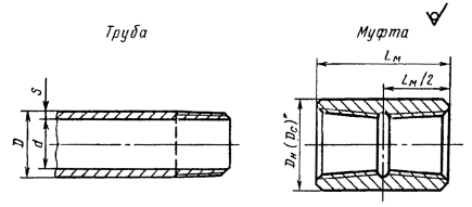 Примечание к табл. 2 - 6. При вычислении массы плотность стали принята равной 7,85 г/см2. (Измененная редакция, Изм. № 3). 1.5. Не допускается овальность труб исполнения Б, превышающая 0,8 предельных отклонений по наружному диаметру за исключением мест ремонта. 1.6. На концевых участках, равных одной трети длины трубы, не допускается изогнутость более 1,3 мм на 1 м длины. Не допускается общая изогнутость всей трубы (стрела прогиба), замеренная на середине трубы, более 1/2000 длины трубы. 1.7. Условное обозначение труб должно включать тип соединения (кроме труб с короткой треугольной резьбой), условный диаметр трубы, толщину стенки, группу прочности и обозначение настоящего стандарта. Условное обозначение муфт должно включать тип соединения (кроме муфт к трубам с короткой треугольной резьбой), условный диаметр трубы, группу прочности, вид муфты (для специальных муфт к трубам ОТТМ и ОТТГ) и обозначение настоящего стандарта. Примеры условных обозначений Трубы из стали группы прочности Д, с условным диаметром 245 мм, с толщиной стенки 10 мм и муфты к ним: 245´10-Д ГОСТ 632-80 - для труб с короткой треугольной резьбой; 245-Д ГОСТ 632-80 - для муфт к этим трубам; У-245´10 Д ГОСТ 632-80 - для труб с удлиненной треугольной резьбой; У-245-Д ГОСТ 632-80 - для муфт к этим трубам; ОТТМ-245´10-Д ГОСТ 632-80 - для труб с трапецеидальной резьбой; ОТТМ-245-Д ГОСТ 632-80 - для муфт нормальных к этим трубам; ОТТМ-245-Д С ГОСТ 632-80 - для муфт специальных (с уменьшенным наружным диаметром) к этим трубам; ОТТГ-245´10-Д ГОСТ 632-80 - для труб с высокогерметичными соединениями; ОТТГ-245-Д ГОСТ 632-80 - для муфт нормальных к этим трубам; ОТТГ-245-Д-С ГОСТ 632-80 - для муфт специальных (с уменьшенным наружным диаметром) к этим трубам. Трубы безмуфтовые раструбные из стали группы прочности Д, с условным диаметром 168 мм, толщиной стенки 9 мм: ТБО-168´9 Д ГОСТ 632-80 Примечания: 1. При заказе труб ОТТМ и ОТТГ со специальными муфтами из стали последующих групп прочности в условном обозначении муфт указывается необходимая группа прочности стали. 2. Для труб и муфт исполнения А после обозначения стандарта ставится буква А. 2. ТЕХНИЧЕСКИЕ ТРЕБОВАНИЯ2.1. Трубы и муфты должны изготовляться в соответствии с требованиями настоящего стандарта и по технологическим регламентам, утвержденным в установленном порядке. 2.2. На наружной и внутренней поверхности труб и муфт не должно быть плен, раковин, закатов, расслоений, трещин и песочин. Допускается вырубка и зачистка указанных дефектов при условии, что их глубина не превышает предельного минусового отклонения по толщине стенки. Заварка, зачеканка или заделка дефектных мест не допускается. В местах, где толщина стенки может быть замерена непосредственно, глубина дефектных мест может превышать указанную в настоящем пункте величину при условии сохранения минимальной толщины стенки, определяемой как разность между номинальной толщиной стенки трубы и предельным для нее минусовым отклонением. Допускаются отдельные незначительные забоины, вмятины, риски, тонкий слой окалины и другие дефекты, обусловленные способом производства, если они не выводят толщину стенки за пределы минусовых отклонений. 2.3. Место перехода высаженной части раструбного конца трубы ТБО к ее части с толщиной стенки 5 не должно иметь резких уступов. На поверхности диаметром Dв на длине lВ min от торца трубы дефекты, указанные в п. 2.2, не допускаютс