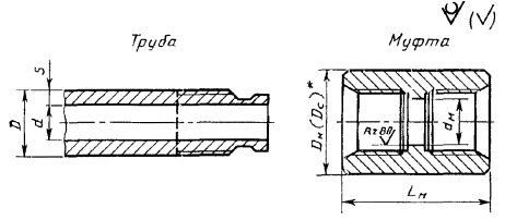 Примечание. По согласованию изготовителя с потребителем трубы могут быть изготовлены с промежуточными и большими значениями толщин стенок. 1.2. Размеры и масса труб и муфт к ним должны соответствовать указанным на черт. 1 и в табл. 2 для соединений с короткой треугольной резьбой, на черт. 1 м в табл. 3 для соединений с удлиненной треугольной резьбой - У, на черт. 2 и в табл. 4 для соединений с трапецеидальной резьбой - ОТТМ и на черт. 3 и в табл. 5 для высокогерметичных соединений - ОТТГ. Размеры и масса безмуфтовых раструбных труб - ТБО должны соответствовать указанным на черт. 4 и в табл. 6. 1.1; 1.2 (Измененная редакция, Изм. № 2, 4). 1.3. Трубы исполнения А и Б должны изготовляться длиной от 9,5 до 13 м. В партии труб с треугольной резьбой и трапецеидальной резьбой - ОТТМ допускается: до 20 % труб длиной от 8 до 9,5 м и не более 10 % труб длиной от 5 до 8 м при их изготовлении из литой заготовки (слитка); до 10 % труб длиной от 8 до 9,5 м и не более 5 % труб длиной от 5 до 8 м при их изготовлении из катаной заготовки. По требованию потребителя допускается изменение количества труб длиной менее 9,5 м в партии, а также изготовление труб длиной менее 5 м. Трубы с высокогерметичными соединениями - ОТТГ и безмуфтовые раструбные трубы - ТБО изготовляют длиной от 9,5 до 13 м. Длина трубы определяется расстоянием между ее торцами, а при наличии навинченной муфты - расстоянием от свободного торца муфты до конца сбега резьбы противоположного конца трубы. Допускается изготовление труб ОТТГ длиной от 8 до 9,5 м в объеме 20 % партии из литой заготовки (слитка). (Измененная редакция, Изм. № 4). Черт. 1 Черт. 2 Черт. 3 * Dн - наружный диаметр нормальной муфты; Dс - наружный диаметр специальной муфты. Черт. 4 (Измененная редакция, Изм. № 1, 2). 1.4. Предельные отклонения по размерам и массе труб и муфт устанавливают следующие: а) по наружному диаметру труб: всех условных диаметров...................................... с условным диаметром до 219 мм включ............ ±1,0 % (исполнение Б); с условным диаметром свыше 219 мм................. ±1,25 % (исполнение Б). Концы труб с треугольной резьбой, ОТТМ и ОТТГ, а также ниппельные концы труб ТБО должны выполняться так, чтобы обеспечивать минимальную длину резьбы с полным профилем без черновик, указанную в п. 2.20, и минимальную толщину стенки в плоскости торца трубы, указанную в примечаниях к табл. 13, 14, 17 и 19. Для раструбных концов труб ТБО допускается увеличение наружного диаметра D на расстоянии (lВmin + D) мм от торца не более чем на 3 мм, а на расстоянии свыше 500 мм от торца предельные отклонения наружного диаметра трубы должны соответствовать указанным в настоящем пункте; б) по толщине стенки...................................... минус 12,5 % Плюсовые отклонения ограничиваются массой трубы; в) по наружному диаметру муфт: нормальных............................................ ±1,0 %, но не более ±3 мм; специальных........................................... г) по длине муфт.................................... ±3,0 мм; д) по массе.............................................. для