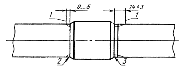 (Измененная редакция, Изм. № 4). 1 - измерительная плоскость резьбового и гладкого калибров-колец; 2 - резьбовой и гладкий калибры-кольца; 3 - труба ОТТГ и ниппельный конец трубы ТБО; 4 - резьбовой калибр-пробка; 5 - гладкий калибр-пробка; 6 - муфта ОТТГ и раструбный конец трубы ТБО; 7 - измерительная плоскость резьбового калибра-пробки; 8 - измерительная плоскость гладкого калибра-пробки; 9 - гладкий калибр-кольцо; 10 - измерительная плоскость гладкого калибра-кольца Черт. 13 2.15.9. При свинчивании вручную оцинкованных или фосфатированных муфт с трубами натяг должен быть равен 10 ± 2 мм (черт. 14). Допускается подбор муфт и концов труб по натягу. 2.15.10. После свинчивания трубы и муфты на станке должно быть обеспечено сопряжение торца трубы и упорного уступа муфты по всему периметру стыка упорных поверхностей (см. черт. 14). Допускается наличие зазора между упорными поверхностями трубы и муфты не свыше 1 мм (для исполнения Б). 1 - конец сбега резьбы; 2 - соединение, свинченное вручную; 3 - соединение, свинченное на станке Черт. 14 2.15.11. Торцы трубы и муфты и упорные уступы муфты должны быть перпендикулярны к оси резьбы. Предельное отклонение от перпендикулярности - 0,06 мм. Предельное отклонение от плоскостности на ширине упорных поверхностей - 0,06 мм. 2.15.12. Оси резьб и оси уплотнительных конических поверхностей труб и муфт должны совпадать. Предельное отклонение от соосности - 0,04 мм. 2.16. Основные параметры и размеры соединений труб безмуфтовых раструбных ТБО 2.16.1. Форма и размеры профиля резьбы ниппельного и раструбного концов труб должны соответствовать указанным на черт. 8 и в табл. 16. 2.16.2. Размеры соединений должны соответствовать указанным на черт. 12 и в табл. 19. 2.16.3. Предельные отклонения от номинальных размеров резьбы должны соответствовать указанным в табл. 21. 2.16.4. Предельные отклонения конусности на всей длине уплотнительного конического пояска ниппельного конца трубы и уплотнительной конической расточки раструбного конца трубы соответственно ±0,03 мм и ±0,06 мм. Таблица 21 мм