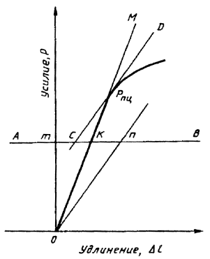Нанесение меток проводят с помощью делительных машин или вручную с применением металлической линейки. На образцах из малопластичных металлов метки наносят способами, исключающими повреждение поверхности рабочей части образца (накаткой делительных сеток или штрихов, фотоспособом, красителем, карандашом). Допускается нанесение меток на переходных частях образца путем кернения или другим способом. Примечания: 1. Если для определения относительного удлинения после разрыва d применяется тензометр, то начальная расчетная длина по тензометру le должна быть равна начальной расчетной длине образца l0. 2. Если на испытательной машине определение относительного удлинения после разрыва d производится автоматически, то нанесение меток для ограничения начальной расчетной длины образца l0 не является обязательным. (Измененная редакция, Изм. № 2, 3). 3.4. Начальную площадь поперечного сечения F0 для образцов сложной формы определяют по расчетным формулам или по массе. Способ определения начальной площади поперечного сечения F0 для таких образцов должен быть оговорен в нормативно-технической документации на металлопродукцию. 4. ПРОВЕДЕНИЕ ИСПЫТАНИЙ И ОБРАБОТКА РЕЗУЛЬТАТОВ4.1. Предел пропорциональности sпц определяют: с помощью тензометров (расчетный способ); графическим способом по начальному участку диаграммы, записанной от электрических силоизмерителя и измерителя деформации. Тензометр или измеритель деформации устанавливают на образец после приложения к нему начального усилия P0, соответствующего напряжению, равному 5 - 10 % от предполагаемого предела пропорциональности sпц. 4.1.1. При определении предела пропорциональности sпц расчетным способом после установки тензометра проводят нагружение образца равными ступенями до усилия, соответствующего напряжению, равному 70 - 80 % от предполагаемого предела пропорциональности sпц. Число ступеней усилия должно быть не менее 4. Время выдержки на каждой ступени до 5 - 7 с. Дальнейшее нагружение проводят более мелкими ступенями. Когда приращение удлинения для малой ступени нагружения превысит среднее значение приращения удлинения (при той же ступени усилия) дальнейшее нагружение прекращают. Определяют среднюю величину приращения удлинения на малую ступень нагружения. Найденную величину увеличивают в соответствии с принятым допуском. Определяют усилие Рпц, соответствующее подсчитанному значению приращения удлинения. Допускается применение метода линейной интерполяции для уточнения значения Рпц. 4.1.2. Определение предела пропорциональности sпц графическим способом проводится по начальному участку диаграммы растяжения, записанной от электрических силоизмерителя и измерителя деформации. Удлинение определяется на участке, равном базе измерителя деформации. Масштаб по оси удлинения должен быть не менее 100:1 при базе измерителя деформации 50 мм и более и не менее 200:1 при базе измерителя менее 50 мм; по оси усилия 1 мм диаграммы должен соответствовать не более 10 Н/мм2 (1,0 кгс/мм2). Из начала координат (черт. 1) проводят прямую, совпадающую с начальным линейным участком диаграммы растяжения. Затем на произвольном уровне проводят прямую АВ, параллельную оси абсцисс, и на этой прямой откладывают отрезок kn, равный половине отрезка mk. Через точку п и начало координат проводят прямую On и параллельно ей про
