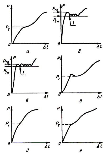 Определяем среднюю величину приращения удлинения образца Dlср на ступень усилия DР = 5400 Н (550 кгс): Dlср = Модуль упругости Е, Н/мм2 (кгс/мм2), равен Е = (Измененная редакция, Изм. № 2). ПРИЛОЖЕНИЕ 7Справочное ПРИМЕРЫ ОПРЕДЕЛЕНИЯ УСИЛИЙ Рт, Ртн, Ртв В ЗАВИСИМОСТИ ОТ ВИДА ДИАГРАММ РАСТЯЖЕНИЯ