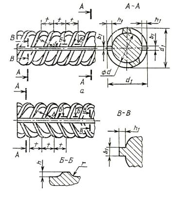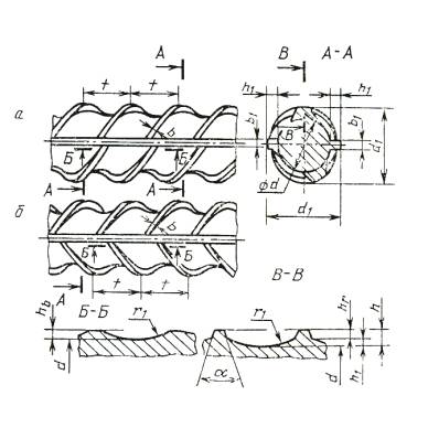 (Измененная редакция, Изм. № 3). 1.5. Масса 1 м профиля вычислена по номинальным размерам при плотности стали, равной 7,85×103 кг/м3. Вероятность обеспечения массы 1 м должна быть не менее 0,9. (Измененная редакция, Изм. № 3). 1.6. Предельные отклонения диаметра гладких профилей должны соответствовать ГОСТ 2590-88 для обычной точности прокатки. 1.7. Арматурная сталь периодического профиля представляет собой круглые профили с двумя продольными ребрами и поперечными выступами, идущими по трехзаходной винтовой линии. Для профилей диаметром 6 мм допускаются выступы, идущие по однозаходной винтовой линии, диаметром 8 мм - по двухзаходной винтовой линии. 1.8. Арматурная сталь класса А-II (А300), изготовленная в обычном исполнении, профилем, приведенным на черт. 1a, и специального назначения Ас-II (Ас300) профилем, приведенным на черт. 2а, должна иметь выступы, идущие по винтовым линиям с одинаковым заходом на обеих сторонах профиля. Сталь класса A-III (A400), изготовляемая профилем, приведенным на черт. 1б, и классов A-IV (A600), A-V (A800), A-VI (A1000) профилем, приведенным на черт. 1б, 2б, должна иметь выступы по винтовым линиям, имеющим с одной стороны профиля правый, а с другой - левый заходы. Черт. 1 Черт. 2 Арматурную сталь специального назначения класса Ас-II (Ас300) изготовляют профилями, приведенными на черт. 1a или 2а. Профиль, приведенный на черт. 2а, специального назначения изготовляется по согласованию изготовителя с потребителем. Форма и размеры профилей, приведенных на черт. 2а и б, могут уточняться. 1.9. Размеры и предельные отклонения размеров арматурной стали периодического профиля, изготавливаемого по черт. 1a и б, должны соответствовать приведенным в табл. 2, а по черт. 2а и б - приведенным в табл. 3. Размеры, мм