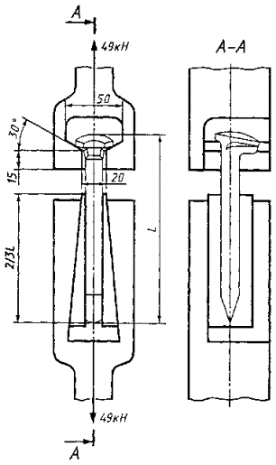 контролируют, указаны для изготовления оснастки с точностью ± ** Размеры для справок. (Измененная редакция, Изм. № 1). 2. ТЕХНИЧЕСКИЕ ТРЕБОВАНИЯ2.1. Костыли должны изготовляться из стали марки Ст4 или Ст3 по ГОСТ 380-94. Для районов с холодным климатом костыли следует изготовлять в исполнении ХЛ по ГОСТ 15150-69 из спокойных сталей указанных марок. 2.2. На поверхности костылей допускаются дефекты металлургического происхождения по ГОСТ 535-88, незначительные обгорания, неотделимая окалина, а также высадочные трещины на затылке головки костыля глубиной не более 0,5 мм. 2.1, 2.2. (Измененная редакция, Изм. № 1, 2). 2.3. На поверхности головки костыля не должно быть заусенцев и наплывов металла высотой более 1,5 мм. Высота складок металла под головкой костыля не должна быть более 2 мм. 2.4. Допускается на стержне костыля наличие технологического следа от отверстия матрицы. 2.5. На стержне костыля не должно быть заусенцев высотой более 2,5 мм. 3. ПРАВИЛА ПРИЕМКИ3.1. Для проверки соответствия костылей требованиям настоящего стандарта предприятие-изготовитель должно проводить приемо-сдаточные испытания на соответствие требованиям пп. 1.1, 2.2-2.7. 3.2. Правила приемки - по ГОСТ 17769-83 для изделий класса точности С. Размер партии не должен превышать 200000 шт. (Измененная редакция, Изм. № 1). 4. МЕТОДЫ ИСПЫТАНИЙ4.1. Размеры костылей (п. 1.1) и состояние поверхности (пп. 2.2-2.6) следует проверять универсальным измерительным инструментом или шаблонами. 4.2. Внешний осмотр костылей следует проводить без применения увеличительных приборов. 4.3. Испытание на растяжение (п. 2.7) следует проводить в приспособлении, схема которого приведена в приложении 1. 4.4. Смещение заостренного конца костыля относительно оси стержня (п. 2.6) измеряют штангенглубиномером типа ШГ-160 по ГОСТ 162-90 или штангенрейсмассом типа ШР-250-0,05 по ГОСТ 164-90. Схема измерения приведена в приложении 2. (Введен дополнительно, Изм. № 1). 5. МАРКИРОВКА, УПАКОВКА, ТРАНСПОРТИРОВАНИЕ И ХРАНЕНИЕ5.1. На головку каждого костыля должна быть нанесена маркировка, содержащая товарный знак или условное обозначение предприятия-изготовителя. На головку удлиненных костылей дополнительно наносят риски: одну - на костылях длиной 230 мм; две - на костылях длиной 205 мм; три - на костылях длиной 280 мм. 5.2. Транспортировать костыли следует транспортом любого вида. 5.3. Костыли одного типоразмера транспортируют без упаковки железнодорожным транспортом, кроме открытых платформ. Допускается транспортировать костыли в универсальных контейнерах по ГОСТ 15102-75, ГОСТ 20435-75, ГОСТ 22225-76, специализированных контейнерах. 5.4. При транспортировании в контейнерах - маркировка по ГОСТ 14192-96. Допускается одновременно транспортировать костыли разных типоразмеров при условии исключения их перемешивания. 5.5. Каждая партия костылей должна сопровождаться документом о качестве, удостоверяющем соответствие их требованиям настоящего стандарта, в котором должно быть указано: - наименование или товарный знак предприятия-изготовителя; - условное обозначение костыля; - результаты испытаний; - масса костылей. 5.6. Хранение костылей - по условиям 7 ГОСТ 15150-69. Разд. 5. (Измененная редакция, Изм. № 1). ПРИЛОЖЕНИЕ 1Справочное СХЕМА ПРИСПОСОБЛЕНИЯ ДЛЯ ИСПЫТАНИЯ КОСТЫЛЕЙ НА РАСТЯЖЕНИЕ