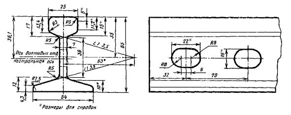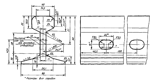Примечания: 1. По требованию потребителя допускается изготовление рельсов типов Р18 и Р24 мерной длины других размеров, не указанных в таблице. 2. Для предприятия лесной и угольной промышленности рельсы типов Р18 и Р24 должны быть мерной длины. 7. Предельные отклонения по длине рельсов мерной длины не должны превышать: ±6 мм - для рельсов с фрезерованными торцами; ±20 мм - для рельсов без фрезеровки торцев (по согласованию между изготовителем и потребителем); Примечание. Для предприятий лесной промышленности рельсы типов Р18 и Р24 должны изготавливаться с предельными отклонениями по длине ±6 мм - с 01.01.91. (Измененная редакция, Изм. № 1). 8. На обоих концах рельса выполняют по два отверстия для болтов. По требованию потребителя рельсы могут быть изготовлены без отверстий для болтов на одном или обоих концах. 9. Высоту шейки рельсов типов Р18 и Р24 проверяют с помощью шаблона по наклонным поверхностям рельсовой пазухи. 10. При прошивке отверстий для болтов контроль размеров производят со стороны входа пуансона. 11. Технические требования к рельсам типов Р18 и Р24 - по ГОСТ 5876, к рельсам типов Р8 и Р11 - по согласованным между изготовителем и потребителем техническим условиям. Справочное