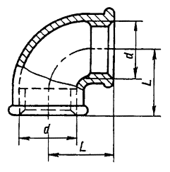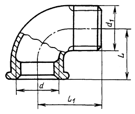 * Для справок Примечания: 1. Угольники с Dу , указанными в таблице в скобках, применять не рекомендуется. 2. Масса оцинкованных соединительных частей не должна превышать массу не оцинкованных более чем на 5 %. Примеры условных обозначенийПроходного угольника с углом 90° исполнения 1 без покрытия с Dу = 40 мм: Угольник 90°- 1-40 ГОСТ 8946- 75 То же, с цинковым покрытием: Угольник 90°-1-Ц-40 ГОСТ 8946- 75. (Измененная редакция, Изм. № 1, 2). 1б. Угольники с углом 45° должны изготовляться двух исполнений: 1 - с внутренней резьбой; 2 - с наружной резьбой. 1в. Основные размеры угольника с углом 45° должны соответствовать указанным на черт. 2 и в табл. 2. Исполнение 1 Исполнение 2