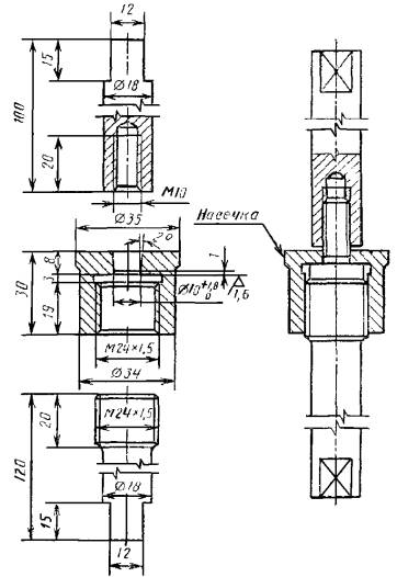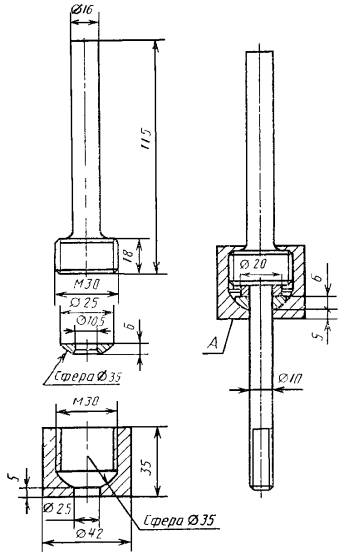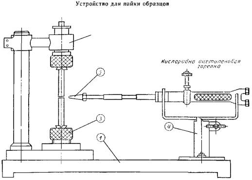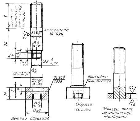 поперечное сечение цилиндрических образцов в месте расположения паяного шва; длину и ширину паяного шва плоских образцов; ширину нахлестки. По полученным результатам вычисляют площадь паяного шва, округляя значения до 0,5 мм2. При вычислении площади паяного соединения сечение галтели не учитывать. 2.7.6. Каждый образец необходимо маркировать в местах, указанных на черт. 9, 11, 13, 14, 15. 2.7.7. Образцы, имеющие на паяном шве или рабочей части коробление, механические повреждения, подрезы, выходящие на поверхность, инородные включения, поры, непропай и неспай, расслоения, раковины, трещины, к исследовательским испытаниям не допускаются. При контрольных испытаниях вид и число дефектов образцов не должны превышать допустимых значений, установленных для паяных изделий. 2.7.8. Допускаемые отклонения от заданной расчетной длины образцов, длины участка рабочей части образца, на котором измеряется удлинение, не должны превышать ±1 %. 2.7.9. Биение цилиндрического образца при проверке в центрах не должно превышать 0,02 мм. 2.7.10. Допускаемое отклонение по площади поперечного сечения не должно превышать ±0,5 %. 2.7.11. Требования к точности измерения образцов до испытаний должны соответствовать ГОСТ 9651, если не предъявляются более жесткие требования. 2.7.12. Допуск плоскостности образца типа IV не должен превышать 2 % толщины образца. 2.7.13. При изготовлении образцов типов I, IV и V следует обеспечивать радиус галтели не более 0,3 мм. Допускается механическая обработка галтели. 2.8. Проведение испытаний на срез, растяжение и длительную прочность 2.8.1. Испытания проводят в приспособлениях, специально обработанных для уменьшения изгибающих напряжений в образцах. Испытания на срез образцов, приведенных на черт. 1 и 2, проводят в приспособлениях, приведенных на черт. 5 и 6. Прочность паяного соединения, выраженную в мегапаскалях, определяют путем деления усилия разрушения, выраженного в Ньютонах на площадь поверхности паяного шва, выраженную в квадратных миллиметрах. Результаты исследования разрушений должны быть указаны в отчете испытаний. Для получения сравнительных характеристик испытываемых припоев при кратковременных испытаниях на срез и растяжение при низких и высоких температурах, а также комнатной температуре необходимо нагружение образцов на испытательной машине выполнять с регулируемой скоростью перемещения в микрометрах в секунду или регулируемым усилием в Ньютонах в секунду. Образцы для испытаний на срез или растяжение при нагреве должны быть подвергнуты нагрузкам в машине для испытания на растяжение, оснащенной печью. Температура образца должна быть стабилизирована в течение 1 ч до приложения нагрузки, а регулировка температуры печи должна быть менее ±1 %. Образцы испытания на длительную прочность испытывают в разрывных машинах, в которых температура испытания должна быть стабильной в течение 2 ч до приложения нагрузки, при этом температура печи должна иметь регулировку менее ±1 % Устройство для испытаний образцов типа I на срез Черт. 5 Приспособление для испытаний образцов типа II на растяжение Черт. 6 Если испытания на ползучесть проводят при комнатной температуре, то машину выбирают без печи. Поверхности излома разрушенных образцов исследуют на наличие дефектов, а результаты исследований записывают в журнале испытаний. 2.8.2. В качестве испытательн