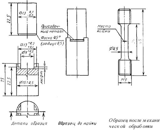 Дата введения 01.01.92 Настоящий стандарт распространяется на паяные соединения металлов и сплавов и устанавливает методы статических испытаний на растяжение и длительную прочность при нормальных, высоких и низких температурах от минус 269 °С до (1200 + 50) °С. Дополнительные требования и рекомендации выполнены курсивом. 0. ВВЕДЕНИЕПаяное соединение образовано из материалов с разными физическими и химическими свойствами. Оно состоит из паяемого материала и припоя. На контактных поверхностях образцов при пайке протекают диффузионные процессы с образованием новых сплавов и соединений. Положение теории упругости, применяемое для однородных металлических тел при расчете напряжений, вызванных внешними силами, передаваемыми равномерно от элемента поверхности или объема к соседним элементам для изучения прочности этих разнородных соединений, не используют. Прочность паяного соединения отличается от прочности паяемых материалов, припоев и зависит от различных факторов. Испытания на определение прочности необходимо проводить, принимая во внимание: химический состав и прочность паяемого материала; форму образца; геометрию и состояние поверхности соединения; флюс; технологию низкотемпературной (мягкой) и высокотемпературной (твердой) пайки (источник нагрева, температура пайки, скорость нагрева и т.д.); время выдержки при температуре пайки; зазор между паяемыми деталями; количество образцов для испытаний; используемые методы представления результатов; характер и размер дефектов на поверхности излома. Настоящий стандарт устанавливает следующие характеристики паяных конструкций: а) при высокотемпературной пайке: временное сопротивление при растяжении при низкой, высокой и комнатной температурах; предел прочности на срез при низкой, высокой и комнатной температурах; предел длительной прочности при повышенной температуре; б) при низкотемпературной пайке: предел прочности на срез при низкой, высокой и комнатной температурах; предел длительной прочности при низкой, высокой и комнатной температурах; временное сопротивление при растяжении при низкой, высокой и комнатной температурах. Примечания: 1. Низкими температурами следует считать температуры от минус 269 °С до плюс 15 °С; 2. Комнатной температурой следует считать температуру (20 ± 5) °С. 3. Высокими температурами следует считать температуры от (20 ± 5) °С до (1200 ± 50) °С. Для получения воспроизводимых и сравнимых результатов испытаний на растяжение и срез стандарт предусматривает методику испытаний и образцы определенного типа. 1. ОБЛАСТЬ РАСПРОСТРАНЕНИЯНастоящий стандарт устанавливает основы и методику испытаний, предназначенные для определения стандартных механических характеристик паяных соединений при высокотемпературной и низкотемпературной пайке, предлагает метод обработки полученных результатов. Стандарт устанавливает требования при статических кратковременных и длительных испытаниях паяных соединений, изготовленных из паяемых материалов, припоев и флюсов путем высокотемпературной и низкотемпературной пайки черных и цветных металлов и сплавов. Стандарт следует применять при контрольных и исследовательских испытаниях. 2. МЕТОДЫ ИСПЫТАНИЙ2.1. Типы образцов 2.1.1. Стандартная прочность на срез Для определения стандартной прочности на срез используют телескопиче