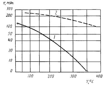 где Pmax - максимальная разрушающая нагрузка, Н (кгс); Fn - площадь паяного шва, мм2. Типичные кривые прочности при испытаниях на сдвиг при длительной прочности 1 - образцы, изготовленные низкотемпературной пайкой при 20 и 200 °С; 2 - образцы, изготовленные высокотемпературной пайкой при 500 °С Черт. 8 3.7. Предел прочности на срез τср, МПа (кгс/мм2), вычисляют по формуле