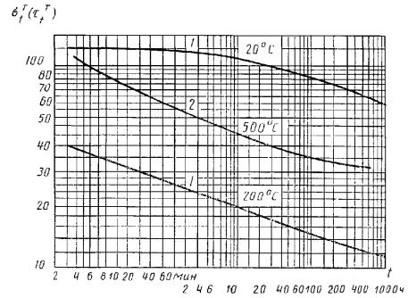 допустимое среднее значение или нецентральному распределению Стьюдента 1,2816 Pp(t > K Pp(t > K Некоторое значение предусмотренного риска оправдано для установленных режимов испытания, т.к. при этом необходимо небольшое количество испытаний, что немаловажно с экономической точки зрения. 3.2. Кратковременная прочность при высокотемпературных испытаниях образцов на срез. Эти испытания позволяют построить кривую разрушающих напряжений в координатах: прочность в мегапаскалях - температура в градусах Цельсия. На черт. 7 приведен пример кривых, полученных по значениям трех температурных испытаний. Типичные кривые прочности при высокотемпературных испытаниях на срез 1 - образец, изготовленный низкотемпературной пайкой; 2 - образец, изготовленный высокотемпературной пайкой Черт. 7 3.3. Испытания на длительную прочность образцов на срез Цель испытаний при одной или нескольких температурах - построения одной или нескольких кривых в координатах: разрушающее напряжение в мегапаскалях - время до разрушения в часах. Напряжения должны выбираться таким образом, чтобы получить время разрушения между 0,1 и 103 ч. Для специальных случаев можно исследовать напряжения, обеспечивающие время разрушения 105 или 106 ч. На черт. 8 приведен пример представления результатов. 3.4. Статистическую обработку результатов испытаний образцов всех типов допускается проводить другим методом, обеспечивающим точность и сопоставимость результатов. Одним из корректных методов обработки результатов является метод, приведенный в приложении 4. 3.5. Не допускается сравнивать результаты испытаний образцов разных типов. 3.6. Временное сопротивление при растяжении (σв), МПа (кгс/мм2), вычисляют по формуле