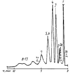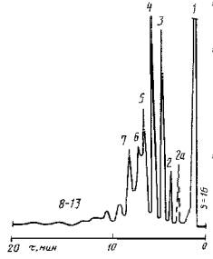 При использовании хроматографов других типов или других твердых носителей допускается изменять условия проведения анализа бензинов, указанные в табл. 1, но при этом бензол должен элюироваться после додекана, а четкость разделения углеводородов должна быть не хуже чем на приведенных хроматограммах (черт. 1). Хроматограммы бензина АИ-92 и внутреннего стандарта (додекан) Фаза ГЦЭГ Фаза OV-275 1 - неароматические углеводороды; 2а - додекан; 2 - бензол; 3 - толуол; 4 - этилбензол, n-, м-ксилол; 5, 6 - о-ксилол, ароматические углеводороды C9; 7 - 13 - ароматические углеводороды С9- С10 Черт. 1 4.3. Хроматограммы рассчитывают с помощью интегратора или ручным способом. 5. ОБРАБОТКА РЕЗУЛЬТАТОВ5.1. Определение поправочных коэффициентов 5.1.1. Для установления поправочных коэффициентов чувствительности детектора к углеводородам относительно стандарта (бензола), поправочный коэффициент для которого принимается равным 1, готовят три - пять калибровочных смесей, имитирующих анализируемый бензин. Например, готовят смесь следующего состава в процентах (по массе): - алкилат (или бензин деароматизированный) 50 - 45 - нонан 4 - 5 - декан 1 - 2 - бензол 5 - 2 - толуол 7 - 10 - этилбензол 3 - 4 - n-ксилол 5 - 4 - м-ксилол 15 - 20 - о-ксилол 5 - 4 - ароматический углеводород С9 100-ΣСi, где ΣСi - сумма массовых долей предыдущих компонентов в смеси, %. Анализ смеси проводят при условиях, указанных в табл. 1. Поправочный коэффициент чувствительности детектора к углеводороду (Ki) вычисляют по формуле