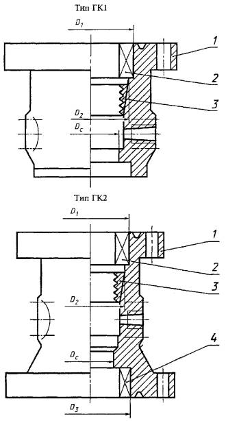 Примеры условных обозначений однофланцевых колонных головок: устанавливаемой на обсадную колонну с условным диаметром 194 мм, со стволовым фланцем 280 ´ 14, с клиньевым трубодержателем под обсадную колонну с условным диаметром 146 мм обычного (некоррозионностойкого) исполнения: Головка колонная ГК1К-194-280´14-146 ГОСТ 30196-94 То же, для коррозионностойкого исполнения К1: Головка колонная ГК1К-194-280´14-146 К1 ГОСТ 30196-94 В.2.1 В шифре колонных головок, выполненных под приварку к обсадной колонне, после условного диаметра обсадной колонны, на которую устанавливается колонная головка, дополнительно указывают индекс «С». Пример: ГК1К-194 С-280´14-146 В.3 Структурная схема построения шифров двухфланцевых колонных головок: