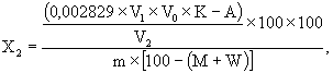 где 28,29 = 0,002829 × 104 (0,002829 масса 3-бутанилизотиоцианата, г, эквивалентная 1 см3 раствора с (КМnО4) = 0,1 моль/дм3; V - объем раствора КМnО4, пошедший на титрование пробы, см3; V2 - объем дистиллята, взятый на титрование, см3; V0 - исходный объем дистиллята; К - поправка концентрации раствора КМnО4; m - масса анализируемого образца, г; М - масличность анализируемого образца, %; W - массовая доля влаги и летучих веществ в анализируемом образце, %. 5.6.5.2. В случае использования вместо раствора фермента семян рапса с известным содержанием изотиоцианатов в них содержание изотиоцианатов (ИТЦ) в шроте рассчитывают следующим образом. Сначала рассчитывают массу изотиоцианатов А в граммах, содержащихся в навеске внесенных семян при фактической масличности и влажности: