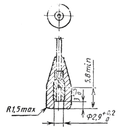 Номинальная площадь поперечного сечения проводов должна быть не менее одного из следующих значений: а) 0,5 мм2 - для обычных световых гирлянд с патронами типа Е5 или Е10 или другими малыми патронами; б) 0,75 мм2 - для других световых гирлянд с патронами типа Е5 или Е10 или другими малыми патронами и световых гирлянд с патронами типов Е14, Е27, В15 или В22 при последовательном включении ламп; в) 1,5 мм2 - для световых гирлянд с патронами типов Е14, Е27, В15 или В22 при параллельном подключении ламп. 1.1.10.2 Для световых гирлянд с одножильным кабелем испытание анкерного соединения кабеля проводят следующим образом. К кабелю 50 раз прикладывают усилие 30 Н. Испытание на крутящий момент не проводят. 1.1.10.3 Штепсельные вилки световых гирлянд должны соответствовать требованиям ГОСТ 7396.1. Световые гирлянды для наружного освещения должны быть либо оборудованы штепсельными вилками, защищенными от брызг, либо иметь неразъемные соединения со стационарной проводкой посредством соединительной муфты. Длина кабеля между штепсельной вилкой и первым патроном должна быть не менее 1,5 м. Соответствие данному требованию устанавливают измерением. Примечание - Патроны в световых гирляндах без сменной проводки с параллельным соединением ламп могут быть подсоединены к плоскому кабелю с помощью штыревых контактов, которые проникают сквозь изоляционное покрытие кабеля и обеспечивают электрический контакт с проводящей жилой. 1.1.11 Защита от поражения электрическим токомЗащита от поражения электрическим током должна соответствовать требованиям ГОСТ 17677 и требованиям настоящего стандарта. 1.1.11.1 Металлические части патронов не должны быть доступны после вставления лампы. Требование не относится к металлическим зажимам или аналогичным монтажным устройствам на патронах. Для световых гирлянд с приспособлением для удержания ламп, отличающимися от патрона типа Е10 или патронов с большей резьбой, защита от поражения электрическим током должна быть аналогична той защите, которая оговорена для световых гирлянд, оборудованных патронами типа Е10. Для штифтовых патронов, являющихся частью световых гирлянд класса защиты II, металлические части цоколей ламп не должны иметь доступа после вставления лампы. Если штепсельная вилка световой гирлянды включает в себя приспособления для отсоединения одного конца гирлянды, чтобы сделать установку более удобной, соединитель, установленный на конце кабеля, должен иметь вход с таким диаметром отверстия и расстоянием от торца до активной части, которые равны соответствующим размерам, указанным на рисунке 1. Для металлических частей патронов и для штифтовых цоколей ламп соответствие устанавливают путем испытания стандартным испытательным пальцем (ГОСТ 14254). Рисунок 1 При проверке недоступности штифтовых цоколей в патрон вставляется лампа с наиболее длинным цоколем. Примечание - Уплотнение по 1.1.7.3 может служить в качестве защиты от случайного прикосновения к штифтовому цоколю ламп. Для штепсельных вилок с приспособлениями для разъединения одного конца гирлянды степень защиты от поражения электрическим током должна быть такой, чтобы отсутствовала возможность прикосновения к контакту стандартным испытательным пальцем (ГОСТ 14254). Контакт представляет собой штырь, закрепленный в корпусе вилки, причем этот штырь должен полностью находи