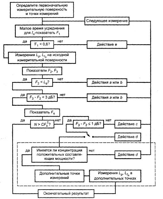 (см. 9.3), F4 следует определять по формулам (А.8) и (А.9), используя значения Рисунок Б.1 - Алгоритм достижения необходимой точности Б.1.3 Проверка концентрации положительных составляющих звуковой мощности и оценка необходимого изменения расположения точек измерений В каждой полосе частот, для которой выполняются условия, указанные в 8.3, располагают в порядке снижения величины положительные составляющие звуковой мощности, проходящие через каждый измерительный сегмент, и выбирают ряд сегментов, через которые проходит более половины общей звуковой мощности. Обозначают через a выбранную часть общей звуковой мощности (a > 0,5). Выбранное таким образом число сегментов Na должно быть менее половины общего числа сегментов N. Применяют методику, установленную ниже, для оценки числа дополнительных точек измерения на этом ряде сегментов. Вычисляют отдельно, согласно А.2.4, показатель F4. а) для ряда сегментов Na, имеющих общую площадь Sa; б) для остальных сегментов. Эти значения F4 обозначают как F4(a) и F4(1 - a), соответственно. Общее число новых точек измерения N*, необходимых на измерительной поверхности Sa, определяют по формуле N* ³ 4[F4(a)Da]2, (Б.4) где N1-a = N - Na. Число точек измерения N* распределяют равномерно по поверхности Sa соответственно площади сегментов. Если ряд сегментов, удовлетворяющих вышеуказанному условию не существует, принимают соответствующие таблице Б.2 альтернативные меры для повышения точности определения звуковой мощности. Б.1.4 Определение нестационарности поля Показатель F1 оценивают перед и после измерения на каждой измерительной поверхности. Если F1 превышает предел, приведенный в таблице Б.2, то следует принять меры для уменьшения нестационарности поля во времени. Б.1.5 Определение наличия посторонних источников сильно направленного действия Если F2 и F3 значительно отличаются друг от друга, то вероятно наличие постороннего источника шума сильно направленного действия. Следует принять меры согласно таблице Б.2. Б.2 Меры, принимаемые для повышения точности измерений В таблице Б.2 указаны меры, которые следует принимать в случаях, когда выбранная измерительная поверхность и/или расположение точек измерения не отвечают требованиям, изложенным в Б.1. Таблица Б.2 - Мероприятия по повышению точности измерений