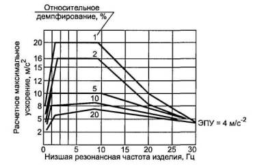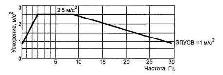 Рисунок 2 - Обобщенные спектры ответа для горизонтального направления 9 баллов в соответствии с [1] или [2] при нулевой отметке 4.3 Если расчетная повторяемость землетрясений и (или) расчетный срок службы (заданные для проектирования или расчета изделий) отличаются соответственно от повторяемости 1 раз в 500 лет и срока L = 50 лет, то выбор сейсмических нагрузок на изделие, в том числе эффективных пиковых ускорений (далее ЭПУ), для разных вероятностных показателей землетрясений и увязку этих показателей с требуемыми вероятностями безотказной работы изделий осуществляют в соответствии с приложениями А и Б. При этом для изделий, предназначенных для атомных станций, как правило, устанавливают значения ускорений, соответствующих следующим значениям повторяемостей: для изделий, относящихся к классам безопасности 3 и 4 по ПНАЭГ-1-011 [3], - 1 раз в 500 лет, относящихся к классам безопасности 1 и 2, - 1 раз в 10000 лет; значения ускорений для других повторяемостей могут быть установлены при наличии специального технического обоснования и в соответствии с показателями надежности изделий. Значение ЭПУ, выраженное в относительных единицах в соответствии с таблицей Б.1, соответствует значениям ускорений спектров воздействия и спектров ответа по рисункам 1 и 2 и таблицам 1 и 2 и может быть использовано для определения значений ускорений, выраженных в м/с2 (g). Пример: Определить значение максимального ускорения воздействия в вертикальном направлении 8-балльного землетрясения для оборудования, расположенного непосредственно на строительных конструкциях на уровне установки над нулевой отметкой 40 м для «вероятности непревышения» 98 % (повторяемость 1 раз в 2000 лет и срока L = 30 лет); оборудования по 4.2, перечисление а). а) Определяем значение максимального ускорения по рисунку 1 (для землетрясения в 9 баллов в горизонтальном направлении, для «вероятности непревышения» 90 %): 2,5 м/с2. б) При помощи коэффициента по таблице 1 определяем значение максимального ускорения для оборудования, расположенного на уровне установки над нулевой отметкой свыше 35 м до 70 м для 8-балльного землетрясения в горизонтальном направлении для той же «вероятности непревышения» 2,5 м/с2·2,5 = 6,25 м/с2, где 2,5 м/с2 - ускорение по перечислению а); 2,5 - коэффициент по таблице 1. в) При помощи определенного в соответствии с приложением Б (см. пример) значения ЭПУ, выраженного в относительных единицах для 8-балльного землетрясения и для «вероятности непревышения» 98 % (1,5, для L = 30 лет), определяем значение максимального ускорения в горизонтальном направлении для указанной «вероятности непревышения» (повторяемость 1 раз в 2000 лет): 6,25 м/с2·1,53 = 9,56 м/с2, г) То же - для вертикального направления: 9,4 м/с2·0,7 = 6,7 м/с2. 4.4 Для изделий, устанавливаемых на промежуточных конструкциях (например, на трубопроводах, арматуре), или при необходимости определения требований к встроенным элементам, входящим в состав комплектных изделий, руководствуются 4.4.1-4.4.3. 4.4.1 В зависимости от АЧХ или ФнЧХ комплектных изделий (например, шкафов, щитов, панелей, пультов) в местах крепления встроенных элементов (или промежуточных конструкций в местах крепления изделий) к указанным встроенным элементам или к изделиям на промежуточных конструкциях могут быть предъявлены дополнительные требования к увеличенным максимальным амплитудам ускорения в диапаз