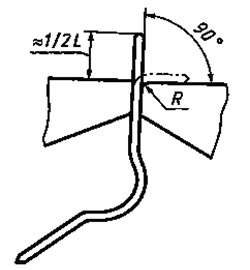 диаметром до Для испытания на загиб предварительно разведенный шплинт зажимают вертикально в губках параллельных тисков (черт. 3) таким образом, чтобы загиб приходился на прямой участок ветви шплинта. Кромки губок должны иметь радиус закругления, указанный в таблице 4. Конец шплинта загибают на 90°, причем после возврата загнутого конца в исходное положение производят загиб в том же направлении.