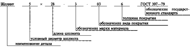 Каждое перемещение загибаемого конца на 90° считают за один загиб. Испытание проводят со скоростью не более одного загиба в секунду. (Измененная редакция, Изм. № 4). 4.5а. Методы проверки качества и толщины покрытий - по ГОСТ 9.302-88. (Введен дополнительно, Изм. № 4). 5. УПАКОВКА И МАРКИРОВКА5.1. Упаковка шплинтов и маркировка тары - по ГОСТ 18160-72. 5.2. Шплинты, имеющие антикоррозионное покрытие, не смазываются. 6. УСЛОВНОЕ ОБОЗНАЧЕНИЕ ШПЛИНТОВ6.1. Шплинты следует обозначать по схеме,