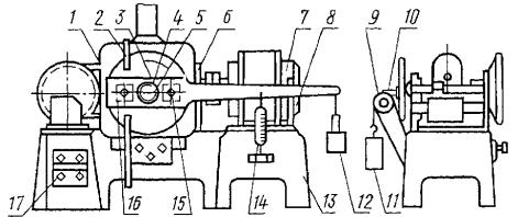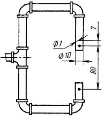 (Измененная редакция, Изм. № 2). 5.3. За результат испытания принимают среднее арифметическое не менее трех значений показателей, отличающихся от среднего не более чем на 10 %. Если результаты испытаний отличаются от среднего значения более чем на 10 % и после обработки осталось менее трех показателей, испытание повторяют и за результат испытаний принимают среднее арифметическое результатов удвоенного количества испытанных образцов. 5.2, 5.3. (Измененная редакция, Изм. № 1). 5.4. Результаты испытаний записывают в протокол, который должен содержать следующие данные: а) дату испытаний; б) способ изготовления образцов; в) шифр резины и условия вулканизации; г) тип шлифовальной шкурки; д) истирающую способность шлифовальной шкурки; е) нормальную силу; ж) силу трения; з) массу двух образцов до испытания после притирки; и) массу двух образцов после испытания; к) плотность резины; л) показатели, характеризующие сопротивление испытуемой резины истиранию и их среднее значение. ПРИЛОЖЕНИЕСправочное 1. Схема одного из вариантов прибора типа МИ-2 для определения сопротивления истиранию при скольжении приведена на черт. 1. 1 - кожух; 2 - воздуховод; 3 - неравноплечий рычаг; 4 - диск; 5 - полый вал; 6 - редуктор; 7 - электромотор; 8 - скоба; 9 - ролик; 10 - грузовой стержень; 11 - постоянный груз; 12 - уравновешивающий груз; 13 - станина; 14 - динамометр; 15 - винты; 16 - рамка-держатель; 17 - выключатель Черт. 1 Воздуховод к прибору Черт. 2 На станине укреплен электромотор, который через редуктор приводит во вращение полый вал с диском. На диске при помощи шайбы и гайки закрепляют шлифовальную шкурку. Диск вращается в вертикальной плоскости. Неравноплечий рычаг несет на себе две рамки-держателя, в которых с помощью винтов укрепляются образцы. Толщина рамки должна быть не менее 1 мм. На рычаге укреплен грузовой стержень, который проходит через полый вал и служит для прижима рычага с образцами к диску. Расстояние между центром каждого образца и осью стержня равно 6,8 см. Прижим осуществляется постоянным грузом, подвешенным к стержню при помощи троса, перекинутого через ролик. Длинное плечо рычага имеет отверстия для подвешивания уравновешивающего груза, удерживающего плечо от вращения в среднем положении в выемке скобы, и динамометра. К рабочей части диска подведен воздуховод, на загнутых концах которого со стороны, обращенной к диску, имеются отверстия диаметром 1 мм для обдувания сжатым воздухом истирающей поверхности (черт. 2). Расстояние трубки с отверстиями до диска равно 20 - 25 мм. Отверстия расположены под углом 45° к рабочей поверхности диска навстречу его движению. Диск помещен в кожух с выводной трубкой, соединяемой с системой вытяжной вентиляции. Для останова машины имеется конечный выключатель, который срабатывает через определенное число оборотов диска. Примечание. Прибор может выпускаться без динамометра. 2. Вычисление работы трения Работу трения двух образцов (А) в Дж (кВт×ч), определяемую на приборе, вычисляют по формулам А = 2pn(P1R + Р2а + Р3R), Дж или
