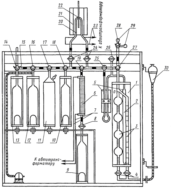 2.1.2. Перед сборкой все стеклянные части прибора тщательно промывают водой. Бюретку 3 и компенсатор давления 5 с компенсационной трубкой 2 дополнительно промывают хромовой смесью или ацетоном, которые затем тщательно смывают водой. На вымытой внутренней поверхности бюретки и компенсатора давления не должны задерживаться капли воды. В процессе использования газоанализатора промывание загрязненной бюретки проводят непосредственно в приборе. При этом, если пользуются хромовой смесью, резиновую трубку к уравнительной склянке 30 (во избежание разъедания ее при промывании) следует заменять другой (запасной) трубкой. Снимают с кранов старую смазку ватой или фильтровальной бумагой, смоченной этиловым спиртом или этиловым эфиром. Затем на пробку наносят тонкий слой солидола, вставляют ее в муфту и осторожно, со слабым нажимом, протирают, вращая до тех пор, пока шлиф не станет прозрачным. Пробки кранов укрепляют в муфте резиновыми кольцами. Компенсатор давления 5 заполняют подкрашенной жидкостью так, чтобы мениск находился на 5 - 6 мм ниже его капиллярных отростков. В компенсационную трубку помещают 1 - 2 капли воды, следя за тем, чтобы вода не задерживалась в верхнем ее отростке. 2.1.3. Сборку прибора начинают с установки креплений по схеме (см. чертеж). При этом все металлические и стеклянные детали должны быть надежно укреплены с помощью зажимов, держателей, подставок. Для обеспечения соединения внутреннюю поверхность резиновых трубок смачивают водой. Концы стеклянных капилляров всегда соединяют встык, для чего, в случае необходимости, их предварительно зачищают наждачной бумагой. Монтаж стеклянных деталей по возможности производят отдельными группами вне прибора. Начинают с монтажа кранов гребенки 15 на планке. Все серповидные краны 14, 16 - 19, 27, 28 и трехходовой кран 25 над манометром компенсатора соединяют так, чтобы они образовали распределительную гребенку газоанализатора. Затем устанавливают бюретку 3 с присоединенной к ней вилкой 4. Вслед за этим постепенно, начиная от бюретки, устанавливают манометр компенсатора 5, трубку с катализатором 6, поглотительные сосуды 9 без насадки и 10 - 13 с насадкой из стеклянных труб. Сосуд 11 устанавливают без резиновой пробки. Над манометром компенсатора должен быть укреплен трехходовой кран 25, над сосудом 10 - серповидный кран 18 и над трубкой с катализатором 6 - серповидный кран 19, а на их отростках - прямые краны 24. Если для поглощения окиси углерода применяют раствор однохлористой меди, то вместо сосуда 13 устанавливают барботажный сосуд, а вместо сосуда 9 - сосуд с насадкой. После установки сосудов к верхним отросткам кранов 24 присоединяют трубку для сжигания 20, предварительно заполненную окисью меди. Электропечь 21 устанавливают в соответствующие гнезда опорной рамы и присоединяют через автотрансформатор, установленный в нулевое положение, к источнику электрического тока 23. Последний серповидный кран 28 присоединяют к верхнему отростку крана 27 бюретки, закрепляя его за верхней стенкой рамы. Свободные капиллярные отростки крана 28 закрывают заглушками 29. К свободному концу вилки 4 через резиновую трубку длиной 75 - 80 см присоединяют уравнительную склянку 30. Трубка с палладиевым катализатором 6 соединяется нижним концом через кран 8 с приемником 9, залитым насыщенным раствором хлористого натрия, верхн