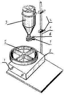 Выборку составляет из единиц упаковки и плит методом случайного отбора в соответствии с ГОСТ 18321-73. Транспортная тара с продуктом или плиты, отобранные в выборку, должны быть тщательно очищены снаружи во избежание засорения продукта. (Измененная редакция, Изм. № 2). 1.3.3. Если вагон, цистерна или битумовоз являются партией, то объем выборки от вагона составляет 15 точечных проб, а от цистерны и битумовоза - 1 точечную пробу. Если партия неупакованного продукта транспортируется в нескольких транспортных средствах, точечные пробы для составления объединенной пробы отбирают от каждого транспортного средства. 1.3.4. Объем выборки от штабеля составляет 15 точечных проб и от хранилища - 3 точечные пробы. 1.4. При получении неудовлетворительных результатов анализа хотя бы по одному из показателей проводят по нему повторный анализ пробы, отобранной от удвоенной выборки той же партии. Результаты повторного анализа распространяются на всю партию. 2. МЕТОДЫ ОТБОРА ПРОБ2.1. Общие требования 2.1.1. Отбор проб из потока, специально подготовленных хранилищ и штабеля, а также из транспортных средств с неупакованным продуктом, проводят в следующем порядке: а) отбирают точечные пробы; б) из точечных проб составляют объединенную пробу; в) из объединенной пробы сокращением получают среднюю лабораторную пробу. 2.1.2. Отбор проб от продукта, упакованного в бочки, мешки и другую транспортную тару, а также от плит, проводят в следующем порядке: а) от единиц упаковки или плит, попавших в выборку, отбирают точечные пробы; б) из точечных проб составляют объединенную пробу; в) из объединенной пробы методом сокращения получают среднюю лабораторную пробу. 2.1.3. Сокращение объединенной пробы жидких продуктов проводят с помощью металлической воронки, сыпучих - механическими делителями. 2.1.4. Массу средней лабораторной пробы указывают в нормативно-технической документации на конкретный продукт. Масса объединенной пробы должна быть не менее удвоенной массы средней лабораторной пробы. 2.1.5. Среднюю лабораторную пробу помещают в герметически закрывающуюся чистую сухую стеклянную или металлическую банку из некорродирующих и не взаимодействующих с пробой материалов или бутылку. Допускается помещать среднюю лабораторную пробу сыпучих продуктов в полиэтиленовую банку или пакет из водонепроницаемого полимерного материала типа полиэтилена. Пакет с пробой завязывают, банку или бутылку герметично закрывают крышкой или пробкой. (Измененная редакция, Изм. № 2). 2.1.6. На банку, бутылку или пакет со средней лабораторной пробой наклеивают этикетку с указанием наименования продукта, обозначения нормативно-технической документации, даты отбора пробы и фамилии пробоотборщика. Дополнительно на этикетки предприятия-потребители указывают наименование предприятия-изготовителя и номер партии. 2.1.7. Обработку проб следует проводить в закрытых, светлых, сухих помещениях, защищенных от попадания прямых солнечных лучей, вдали от отопительных приборов. (Введен дополнительно, Изм. № 1). 2.1.8. Ручные пробоотборники, емкости для приемки и транспортирования проб (перед отбором проб) должны быть чистыми и сухими. (Введено дополнительно, Изм. № 2). 2.2. Аппаратура 2.2.1. Для отбора проб из потока применяются: Пробоотборник автоматический типа АП-2М1 для жидких продуктов (черт. 1). Пробоотборник механически
