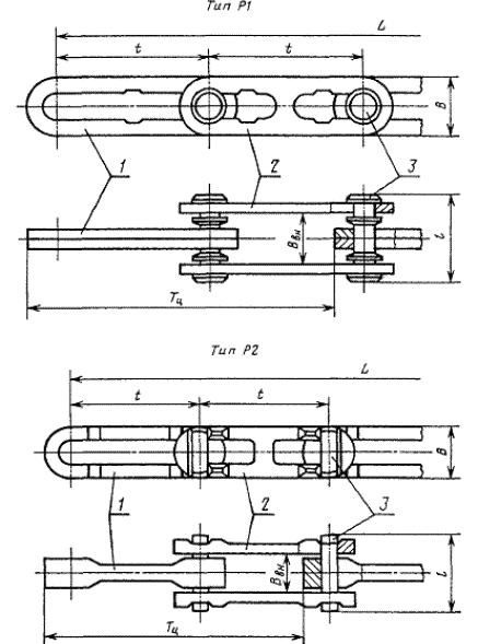 Постановлением Государственного комитета СССР по стандартам от 25 сентября 1985 г. № 3024 дата введения установлена с 01.01.87 Ограничение срока действия снято Постановлением Госстандарта от 03.02.92 № 100 Настоящий стандарт распространяется на тяговые разборные цепи (далее - цепи), предназначенные для применения в конвейерах и других подъемно-транспортных машинах и механизмах. Стандарт соответствует СТ СЭВ 535-77 в части типов, основных параметров и размеров (см. приложение 3). 1. ТИПЫ, ОСНОВНЫЕ ПАРАМЕТРЫ И РАЗМЕРЫ1.1. Цепи должны изготовлять двух типов: Р1 - с вращающимися валиками; Р2 - с фиксированными валиками. 1.3. Дополнительные размеры деталей цепей типа Р2 приведены в приложении 1. 1.4. Коды ОКП приведены в приложении 2. Пример условного обозначения цепи типа Р1 с шагом звена 80 мм и разрушающей нагрузкой 106 кН: Цепь Р1-80-106 ГОСТ 589-85 То же, цепи типа Р2: Цепь Р2-80-106 ГОСТ 589-85