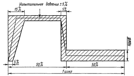 Примечание. Динамические испытания рукавов групп А, Б, В изготовитель не проводит. (Измененная редакция, Изм. № 4, 6). 3.4. (Исключен, Изм. № 6). 3.4а. (Исключен, Изм. № 4). 3.5. При получении неудовлетворительных результатов испытаний хотя бы по одному из показателей по нему проводят повторные испытания удвоенного количества рукавов, взятых от той же партии. Результаты повторных испытаний, кроме испытания на герметичность, распространяются на всю партию. При неудовлетворительных результатах повторных испытаний на герметичность проверке подвергают каждый рукав партии. При неудовлетворительных результатах повторных испытаний по п. 3.3 проверке подвергают каждую партию рукавов до получения положительных результатов испытания не менее чем для трех партий подряд. (Измененная редакция, Изм. № 6). 4. МЕТОДЫ ИСПЫТАНИЙ4.1. Размеры элементов рукавов проверяют измерительными приборами, обеспечивающими заданную точность измерений: штангенциркулем по ГОСТ 166, толщиномером по ГОСТ 11358, измерительной линейкой по ГОСТ 427, стенкомером индикаторным, рулеткой по ГОСТ 7502, микроскопом по ГОСТ 8074. Для измерения наружного диаметра верхней металлической оплетки на расстоянии не менее 2,5 dвн от конца рукава по окружности срезают слои, находящиеся над оплеткой, в виде кольца шириной 8 - 10 мм и измеряют штангенциркулем. Внутренний диаметр рукава измеряют цилиндрическими калибрами, при этом проходная сторона калибра должна проходить в рукав на расстояние 50 мм от конца рукава. Длину рукава определяют измерительной линейкой или рулеткой. (Измененная редакция, Изм. № 5, 6, 7). 4.2. Для определения морозостойкости рукав выдерживают при температуре, не выше указанной в п. 2.6, в течение не менее 4 ч. Затем при заданной температуре и не более чем через 15 с после воздействия заданной температуры в течение 8 - 12 с рукава внутренним диаметром до 22 мм включительно изгибают на 180°, а рукава внутренним диаметром свыше 22 мм - на 90° вокруг оправки диаметром 2R, где R - минимальный радиус изгиба. После испытания температуру рукава доводят до комнатной. На наружной поверхности рукава не должно быть трещин и при испытании гидравлическим давлением, указанным в п. 2.7, рукав должен быть герметичным. (Измененная редакция, Изм. № 6). 4.3. Для проведения испытаний гидравлическим давлением применяют: источник давления с манометром класса точности до 2,5 по ГОСТ 2405, обеспечивающим проведение испытаний в рабочей зоне шкалы манометра. Манометр подбирают так, чтобы измеряемая величина находилась от 1/3 до 4/5 предела измерения; секундомер 2-го класса точности; часы типа ВЧС-1-М2ПВ; линейку металлическую измерительную по ГОСТ 427. (Измененная редакция, Изм. № 7). 4.3.1. Для испытания на герметичность один конец рукава присоединяют к источнику давления и наполняют рукав рабочей жидкостью до полного удаления воздуха. Затем другой свободный конец рукава заглушают и в течение 1 - 2 мин повышают давление до 2Р + 5 %. После этого источник давления отключают и выдерживают рукав под установленным давлением (2 ± 1) мин. Допускается в течение первой минуты дополнительно подключать источник давления. Допускается вместо определения времени повышения давления определять скорость повышения давления. Рукав считают выдержавшим испытание, если по истечении указанного времени на его поверхности не будут обнаружены разрывы и капли раб