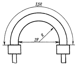 где l - длина участка, измеренного при рабочем давлении, мм. (Измененная редакция, Изм. № 4). 4.8. (Исключен, Изм. № 4). 4.9. Изменение массы внутреннего и наружного резинового слоя в соответствии с п. 2.13 определяют по ГОСТ 9.030 на образцах резины внутреннего и наружного слоя, отслоенного от рукава и тщательно зачищенного от клея и нитей. 4.10. (Исключен, Изм. № 4). 4.11. Для определения состояния внутренней поверхности от рукава отрезают образец длиной не менее 300 мм, разрезают его вдоль оси или направляют его на источник света и поворачивают вокруг оси. Определение проводят визуально или сравнением с контрольным образцом. (Измененная редакция, Изм. № 6). 4.12. Состояние наружной поверхности рукавов, в том числе наличие и содержание маркировки, определяют визуально или сравнением с контрольным образцом. Конструкцию рукава проверяют визуально в торце рукава. (Измененная редакция, Изм. № 6, 7). 4.13. Для проведения динамических испытаний в соответствии с требованиями табл. 6а рукава с концевой арматурой присоединяют к источнику, обеспечивающему изменение давления с частотой от 30 до 75 циклов/мин, при этом каждый цикл должен отвечать требованиям импульсного цикла, указанным на черт. 2. Температура испытательной жидкости должна быть (93 ± 5) °С. Рукава диаметром до 22 мм включительно должны иметь свободную длину, в 3,5 раза превышающую минимальный радиус изгиба с допуском ± 1 %, и должны быть присоединены таким образом, чтобы рукав был изогнут на 180°, т.е. чтобы арматуры располагались параллельно и расстояние между концами было в 2 раза больше минимального радиуса изгиба, как указано на черт. 3. Импульсный цикл динамического испытания рукавов Черт. 2* * Черт. 1. (Исключен, Изм. № 4). Рукава с внутренним диаметром свыше 22 мм должны иметь свободную длину не менее 0,4 м и должны быть присоединены в прямом положении. Допускается по требованию потребителей испытывать рукава с диаметром св. 22 мм в изогнутом состоянии. Для испытания применяют любую рабочую жидкость. После испытания на рукаве, находящемся под давлением, не должно быть разрывов, дефектов и течи. Если рукав выдержал испытания в соответствии с требованиями п. 2.19, но при этом обнаружена течь и дефекты на расстоянии не более 25 мм от места закрепления, рукав считают выдержавшим испытания. Схема изгиба рукавов при динамических испытаниях R - минимальный радиус изгиба Черт. 3 Если рукав не выдержал испытания по п. 2.19 из-за течи или дефектов на расстоянии не более 25 мм от места закрепления и при этом течь или дефекты искажают формы импульсного цикла, указанного на черт. 2, то испытание считают недействительным и повторяют его на другом образце рукава. (Измененная редакция, Изм. № 4). 5. МАРКИРОВКА, УПАКОВКА, ТРАНСПОРТИРОВАНИЕ И ХРАНЕНИЕ5.1. На каждом рукаве по всей длине должна быть нанесена четкая маркировка с указанием: а) товарного знака или наименования и товарного знака предприятия-изготовителя; б) типа рукава; в) внутреннего диаметра; г) рабочего давления; д) месяца или квартала и года изготовления; е) знака «Л» при применении латунированной проволоки; ж) обозначения настоящего стандарта. Кроме того, на каждом рукаве должен быть штамп технического контроля. Маркировку наносят тиснением или несмываемой краской белого или другого светлого цвета. На каждом рукаве Z несмываемой краской должна быть нанесена четкая маркировка с 