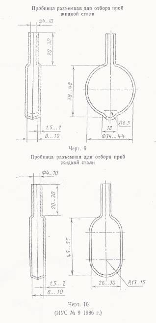 Изменение № I ГОСТ 7565-81 Чугун, сталь и сплавы. Метод отбора проб для определении химического состава Постановлением .Государственного комитета СССР по стандартам от 11.06.86 № 1451 срок введения установлен с 01.01.87 Под наименованием стандарта проставить код: ОКСТУ 0809. Пункт 1.4. Заменить слова: «не более 1 кг» на 0,1 — 1 кг. Пункт 1.10. Исключить слово: «около». Пункт 1.11. Заменить слова: «диаметром 15 мм» на «диаметром 10—20 мм». Пункт 1.12; Заменить слова: «Стружка должна быть толщиной 0,3—0,4 мм» на «Стружка должна быть толщиной не более 0,4 мм». Пункт 2.1. Третий абзац дополнить словами: «При разливке плавок небольшой массы в один сифон проба отбирается в начале или конце разливки»; дополнить абзацем: «Па автоматических формовочных линиях со стационарной разливной металла из ковшей емкостью до 30 т допускается отбирать пробы до начала разливки». Пункты 2.2, 2.3 после слова «сталей» дополнить словами: «и сплавов». Пункт 2.2 после слова «ковша» дополнить словами: «На установках, не оборудованных промежуточным ковшом, допускается отбирать пробу в конце разливки». Пункт 2.4 после слова «стали» дополнить словами: «и сплавов»; дополнить абзацем: «Допускается для определения химического состава стали и сплавов, выплавленных в вакуумных индукционных печах, отбирать пробу металла из тигля печи перед началом разливки». Пункт 2.5 после слова «стали» дополнить слонами: «и сплавов». Пункт 2.7 изложить в новой редакции- «2.7. Схемы стаканчиков-изложниц для отбора проб и пробниц разового пробоотборного устройства приведены на черт. 1—3, 5, 8—10 рекомендуемого приложения 1». Пункт 2.8 до слова «Допускается» изложить в новой редакции: «Масса пробы для химического анализа должна быть 0,3—2,0 кг, для спектрального анализа — 0,06—1,0 кг». Пункт 2.17 до слова «Подготовленную» изложить в новой редакции: «2.17. Короткую стружку толщиной не более 0,4 мм тщательно перемешивают». Пункт 2.18 после слов «толщиной 1,5—2,0 мм» дополнить словами: «а у проб, взятых разовым пробоотборным устройством, с одной из плоскостей пробы снимают слой 0,5—1,0 мм». Пункт 3.13 дополнить словами: «В зависимости от размера темплета допускается разрезать образец па несколько частей». Приложение 1 дополнить чертежами 8—10: Пробница разъемная для отбора проб, жидкой стали