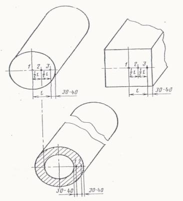 3.1. Химический состав плавки стали и сплавов, при необходимости, определяют по пробе, отобранной от слитков, непрерывнолитых заготовок, кованого металла или проката. Отбор проб проводят от слитка или непрерывнолитой заготовки, соответствующих середине плавки, сверлением или вырезкой куска металла из средней части слитка на глубину 50—70 мм. 3.2. Для определения химического состава стали и сплавов открытой выплавки отбирают не менее трех единиц проката. От отобранной единицы проката или кованого металла отбирают одну пробу. 3.3. Для определения химического состава металла вакуумно-индукционной плавки пробу отбирают от одного или нескольких слитков, передельных заготовок, единиц готового проката; для металла вакуумно-дугового и электрошлакового переплавов — от слитков, передельных заготовок или единиц готового проката, полученных из металла одной исходной плавки переплавом по одному и тому же режиму. Для металла вакуумно-индукционной выплавки и вакуумно-дугового переплава пробы отбирают от верхней части, электрошлакового переплава — от нижней части слитка или соответствующих им передельных заготовок или готового проката. 3.4. Пробу в виде стружки для химического анализа берут от пробы или непосредственно от контролируемой единицы проката, заготовки, слитка. Поверхность металла перед отбором стружки для химического анализа тщательно очищают от окалины и механических загрязнений. При обезуглероживании или науглероживании стали поверхность зачищают до полного удаления указанных слоев. 3.5. Для слитков, катаной и кованой заготовки, а также для поковок, сортового, фасонного, полосового проката и бесшовных труб стружку отбирают одним из способов: обработкой всего поперечного сечения проката или симметричной половины его; сверлением поперечного сечения вдоль направления прокатки на расстоянии 1/2 радиуса, 1/4 диагонали от поверхности или 1/2 толщины стенки трубы в соответствии с черт. 1 обязательного приложения 2; сверлением одной из боковых поверхностей на глубину до середины пробы в соответствии с черт. 2 приложения 2; сверлением поперечного сечения в соответствии с черт. 3 приложения 2 для поковок диаметром или стороной квадрата более 500 мм. Для проката малых сечений допускается сверление насквозь, при этом в фасонных профилях сверлят в середине ширины полки или 1/4 высоты профиля в соответствии с черт. 4 приложения 2. Для крупных фасонных профилей обработка всего поперечного сечения может быть заменена сверлением в разных точках по всему поперечному сечению с равномерным распределением и одинаковой глубиной сверления. 3.6. Для толстолистовой, широкополосной стали, бесшовных и сварных труб с толщиной стенки 4 мм. и более пробу отбирают сверлением в трех точках, при этом для толщин до 50 мм включительно— на всю толщину, для толщин более 50 мм. — до половины толщины. Для листов и полос сверлят на расстоянии 10—15 мм от края, в середине ширины и в середине между двумя указанными точками. Для сварных труб сверлят на расстоянии 20—25 мм от шва в точке, диаметрально противоположной шву, и в середине между двумя указанными точками. 3.7. Для тонколистовой стали, лент, бесшовных и сварных труб с толщиной стенки менее 4 мм стружку отбирают обработкой но всему сечению пробы, вырезанной из листа или ленты поперек направления прокатки, или отрезка 