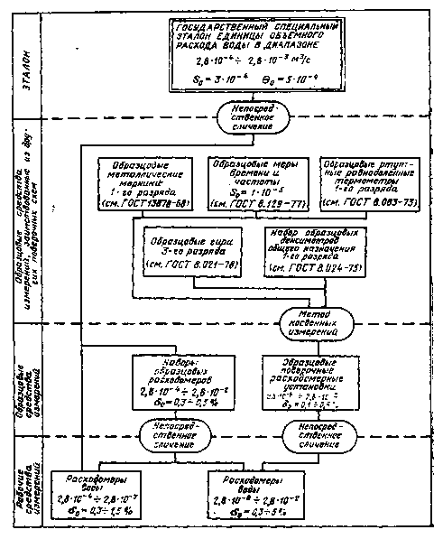 Постановлением Государственного комитета СССР по стандартам от 22 февраля с 01.01. Настоящий стандарт распространяется на государственный специальный эталон и общесоюзную поверочную схему для средств измерений объемного расхода воды в диапазоне 2,8·10-8÷2,8·10-2 м3/с и устанавливает назначение государственного специального эталона единицы объемного расхода воды в диапазоне 2,8·10-4 ÷ 2,8·10-3 м3/с кубического метра в секунду (м3/с), комплекс основных средств измерений, входящих в его состав, основные метрологические параметры эталона и порядок передачи размера единицы объемного расхода воды от специального эталона при помощи образцовых средств измерений рабочим средствам измерений с указанием погрешностей и основных методов поверки. 1. ГОСУДАРСТВЕННЫЙ СПЕЦИАЛЬНЫЙ ЭТАЛОН1.1. Государственный специальный эталон предназначен для воспроизведения и хранения единицы объемного расхода воды в диапазоне 2,8·10-4 ÷ 2,8·10-3 м3/с и передачи размера единицы при помощи образцовых средств измерений рабочим средствам измерений, применяемым в народном хозяйстве СССР с целью обеспечения единства измерений в стране. 1.2. В основу измерений объемного расхода воды в диапазоне 2,8·10-8÷2,8·10-2 м3/с, выполняемых в СССР, должна быть положена единица, воспроизводимая указанным государственным эталоном. 1.3. Государственный специальный эталон состоит из комплекса следующих средств измерений: прецизионный генератор сигналов; дискретный электропривод; гидровытеснитель; гидроразделитель; измерительный участок с переключателями потока; пульт управления. 1.4. Диапазон значений объемного расхода воды, воспроизводимый эталоном, составляет 2,8·10-4 ÷ 2,8·10-3 м3/с. 1.5. Государственный специальный эталон обеспечивает воспроизведение единицы со средним квадратическим отклонением результата измерений (S0)» не превышающим 3·10-4, при неисключенной систематической погрешности (Θ0), не превышающей 5·10-4. 1.6. Для обеспечения воспроизведения единицы объемного расхода воды в диапазоне 2,8·10-4 ÷ 2,8·10-3 м3/с с указанной точностью должны быть соблюдены правила хранения и применения эталона, утвержденные в установленном порядке. 1.7. Государственный специальный эталон применяют для передачи размера единицы объемного расхода воды образцовым и рабочим средствам измерений высокой точности непосредственным сличением. 2. ОБРАЗЦОВЫЕ СРЕДСТВА ИЗМЕРЕНИЙ2.1. Образцовые средства измерений, заимствованные из других поверочных схем 2.1.1. В качестве образцовых средств измерений, заимствованных из других поверочных схем, применяют образцовые металлические мерники 1-го разряда, образцовые меры времени и частоты, образцовые ртутные равноделенные термометры 1-го разряда, образцовые гири 3-го разряда, набор образцовых денсиметров общего назначения 1-го разряда. 2.1.2. Образцовые средства измерений, заимствованные из других поверочных схем, применяют для аттестации образцовых средств измерений методом косвенных измерений. 2.2. Образцовые средства измерений. 2.2.1. В качестве образцовых средств измерений применяют наборы образцовых расходомеров и образцовые поверочные расходомерные установки с соотношением диапазонов измерений не менее 1:5. Общесоюзная поверочная схема для средств намерений