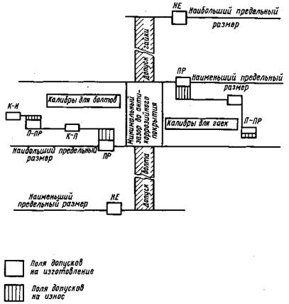 Пример условного обозначения резьбового калибра: Калибр-кольцо 40×4 ПР ГОСТ 8762-75 То же, гладкого калибра: Калибр-пробка 40×4 НЕ ГОСТ 8762-75 То же, резьбового контркалибра: Контркалибр-пробка 40×4 К-П ГОСТ 8762-75 Примечание. Условные обозначения, принятые настоящим стандартом, не должны использоваться в случаях обязательного применения кодов общесоюзного классификатора промышленной и сельскохозяйственной продукции*. * На территории Российской Федерации действует ОК 005-93. 2.2 Расположение полей допусков наружного диаметра болта и внутреннего - гайки должно соответствовать схеме, указанной на черт. 6.