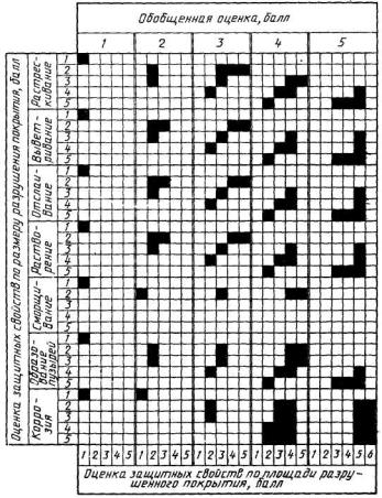 (Измененная редакция, Изм. № 1, Изм. № 2). 3.2. За обобщенную оценку принимают максимальный балл по табл. 6, полученный одним из видов разрушения, например оценка видов разрушения по табл. 2-Г2, Ц4 и по табл. 6, соответственно 3 и 4 балла, обобщенная оценка (АД) - 4 балла. 3.3. Обобщенную оценку внешнего вида по комплексу изменений защитных свойств (A3) дополнительно проводят по табл. 7, при этом каждый балл по табл. 4 и 5 оценивают по обобщенной шкале табл. 7. 3.4. За обобщенную оценку принимают максимальный балл по табл. 7, например оценка видов разрушения по табл. 4 и 5 – С3/4, К5/4 или Т2/3, К3/2 и по табл. 7, соответственно 4 и 5 или 2 и 3 балла, обобщенная оценка (AЗ) - АЗ5 и АЗ3. (Измененная редакция, Изм. № 2). 3.5. Обобщенную оценку внешнего вида покрытия по изменению декоративных и защитных свойств записывают через запятую, например, АДЗ, А34. При проведении научно-исследовательских работ и для подробной характеристики внешнего вида покрытия запись осуществляют в соответствии с пп. 2.2.7 и 2.3.8 по всем видам разрушения. 3.3-3.5. (Измененная редакция, Изм. № 1). 3.6. Количественную оценку внешнего вида покрытия по изменению декоративных и защитных свойств допускается проводить по рекомендуемому приложению. Таблица 7