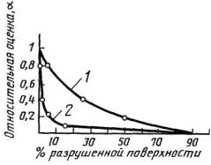 Для определения более точных относительных оценок отдельных видов разрушения рекомендуется пользоваться калибровочными кривыми (см. чертеж); для растрескивания, отслаивания, выветривания, сморщивания, образования пузырей, растворения - кривая 1, для коррозии металла - кривая 2.