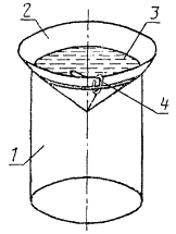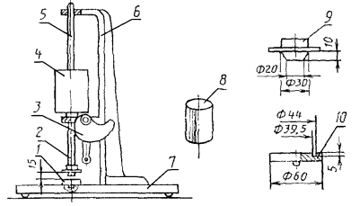 где n - количество определяемых характерных показателей; Kij - коэффициент сохранения, учитывающий степень изменения i-го показателя после воздействия j-ой специальной среды. 7.7.3. При обработке результатов испытаний используют метод математической обработки (математической статистики) с доверительной вероятностью 0,95. 7.7.4. Протокол испытаний - по п. 1.7.4 с учетом требований п. 7.7.2. 8. МЕТОД ОПРЕДЕЛЕНИЯ СОПРОТИВЛЕНИЯ ПРОКАЛЫВАНИЮ8.1. Сущность метода заключается в определении прочности материала в натянутом состоянии под действием вдавливания в него наконечника конусной формы. 8.2. Метод применяется для испытаний полимерных пленок, бумаги и ткани с пароводонепроницаемыми покрытиями. 8.3. Отбор проб и образцов - по пп. 1.3.1 - 1.3.4. 8.3.1. Образцы или пробы для испытаний должны иметь форму круга диаметром 110 мм. 8.3.2. Количество образцов для испытания - по п. 1.3.7. Машина разрывная, отвечающая требованиям ГОСТ 13525.1-79 и ГОСТ 14236-81, в комплекте с приспособлением для испытания на сжатие. Устройство для испытания материалов на прокалывание (черт. 15). Внутренний диаметр опоры должен быть равен (20 ± 1) мм; диаметры стержня наконечника и торца конуса наконечника должны быть соответственно равны (10 ± 0,1) мм и (3 ± 0,05) мм; угол конусности должен быть равен 15°. 8.5. Подготовка к испытаниям 8.5.1. На торец стакана накладывают образец или пробу исследуемого материала и закрепляют его с помощью стяжной ленты. 8.5.2. Приспособление для испытания на сжатие с закрепленным на нем стаканом устройства устанавливают в разрывную машину и выводят ползун в верхнее положение до упора. 1 - приспособление для испытания на сжатие; 2 - стакан; 3 - опора; 4 - наконечник; 5 - образец или проба; 6 - стяжная лента Черт. 15 8.5.3. Наконечник устройства закрепляют в верхней части подвижной рамки приспособления с помощью штифта. 8.5.4. Опускают и закрепляют с помощью штифта подвижную рамку приспособления в ползуне. 8.5.5. Проводят балансировку системы силоизмерителя с установкой ведущей стрелки циферблата на «нуль». 8.6. Проведение испытаний 8.6.1. Испытания проводят при температуре (20 ± 2) °С и относительной влажности (50 ± 5) %. 8.6.2. Включают разрывную машину со скоростью передвижения ползуна 50 мм/мин и вдавливают наконечник устройства в испытуемый материал до момента его сквозного прокалывания. 8.7.2. Среднее арифметическое значение сопротивления прокалыванию (Pпр) в кгс вычисляют по формуле