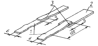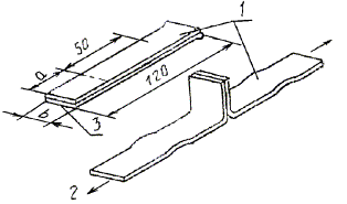 где n - число испытанных образцов или проб; Pпрi - максимальное разрушающее усилие для i-го образца, кгс. 8.7.3. При обработке результатов испытаний используют метод математической обработки (математической статистики) с доверительной вероятностью 0,95. 8.7.4. Протокол испытаний - по п. 1.7.4 с учетом требований п. 8.7.1. 9. МЕТОД ОПРЕДЕЛЕНИЯ ТЕМПЕРАТУРЫ СПОЛЗАНИЯ ГЕРМЕТИЗИРУЮЩИХ СОСТАВОВ9.1. Сущность метода заключается в определении температуры, соответствующей моменту сползания герметизирующего состава с вертикальной поверхности. 9.2. Отбор образцов 9.2.1. Образцы для испытания изготавливают из герметизирующих составов, отвечающих технической документации на состав конкретного вида. 9.2.2. Образцы должны иметь форму прямой прямоугольной призмы размером (20 × 15 × 10) мм. 9.2.3. Количество образцов для испытания - по п. 1.3.7. Камера тепла или термостат, обеспечивающие поддержание температуры до (150 ± 2) °С. Термометр - по ГОСТ 2823-73. Пластинки стальные размером (100 × 100) мм толщиной 1 - 3 мм, покрытые эмалями для окрашивания наружных поверхностей изделий. 9.4. Подготовка к испытаниям 9.4.1. Образцы прикрепляют к стальной пластине боковыми гранями, имеющими площадь 200 мм2 (черт. 16), путем легкого нажатия на них руками. Верхние грани образцов должны находиться на одной линии. 9.5. Проведение испытаний 9.5.1. Подготовленные по п. 9.4.1 образцы подвешивают к камере тепла или термостате в вертикальном положении. 9.5.2. Испытания начинают при температуре (20 ± 2) °С с постепенным повышением температуры в камере со скоростью (1 - 2) °С/мин. Требуемая скорость повышения температуры в камере предварительно устанавливается регулировкой с помощью электрических приборов, обеспечивающих изменение подаваемого на нагревательные элементы камеры или термостата напряжения или тока. 1 - образец; 2 - металлическая пластина Черт. 16 9.6.1. Критерием оценки является минимальная температура tсп в °С, при которой начинается сползание одного из образцов от исходного положения. 9.6.2. Протокол испытаний - по п. 1.7.4 с учетом требований п. 9.6. 10. МЕТОД ОПРЕДЕЛЕНИЯ ЛИПКОСТИ10.1. Сущность метода заключается в определении скорости расслоения склеенных между собой участков полимерной липкой ленты под действием статической нагрузки. 10.2. Отбор образцов Заготовками для образцов служат полоски полимерных лент с липким слоем длиной 400 мм и шириной 25 мм в количестве не менее трех. Приспособление для испытаний (черт. 17). Валик стальной обрезиненный диаметром 40 - 50 мм, массой не менее 5 кг. Груз (масса груза с нижним зажимом 300 г). Секундомер - по ГОСТ 5072-79. Полоски бумаги длиной 50 мм и шириной 25 мм. 10.4. Подготовка к испытаниям 10.4.1. На концы образцов (с липкой их стороны) накладывают полоски бумаги. 10.4.2. Образцы перегибают пополам липкой стороной внутрь и прокатывают обрезиненным валиком не менее пяти раз. Не допускается появление воздушных пузырей между склеенными частями образца. 10.4.3. На расстоянии 100 мм от места сгиба склеенного образца наносят метку, после чего из середины образца (вдоль) вырезают полоску шириной 15 мм и длиной 100 мм. 10.5. Проведение испытаний 10.5.1. Одни конец полоски закрепляют в верхнем зажиме приспособления. 10.5.2. На свободном конце полоски закрепляют нижний зажим с грузом. 10.5.3. Отсчет времени расслоения склеенного участка начинают с момента подхода линии расслоения к нанесенной метке и заканчивают при полном рассл