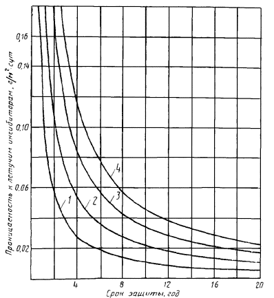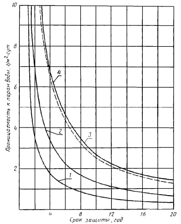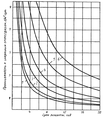 При расчетах принимаются следующие условия и ограничения: расчетные интервалы времени ∆τij = const = 30 сут; среднемесячные температуры ti и относительной влажности ri воздуха для конкретных условий хранения - на основании статистических данных метеорологических станций; значения величин состояния защитных сред в начале первого расчетного интервала (i = 1); Bbi = 0; C0 = 99,9; r = 0; значения показателей проницаемости герметизирующих материалов к парам; воды, инертным газам, летучим ингибиторам для каждого расчетного интервала времени определяют в соответствии с требованиями настоящего стандарта. Предельно допустимые значения показателей состояния защитных сред, применяемых при расчетах, равны: Rвн = 60 %; Cn ≥ 96 %; rn ≤ 95 %. 5. Формулы прогнозирования могут использоваться для разработки алгоритма и составления программы для ЭВМ. 6. Определение допустимых сроков защиты изделий при хранении с использованием герметизирующих материалов может проводиться с помощью номограмм (черт. 20 - 22). Приведенные номограммы составлены для условий хранения 1.2 по ГОСТ 15150-69. Номограмма (черт. 20) устанавливает зависимость сроков защиты изделий от проницаемости к парам воды герметизирующих материалов, используемых при консервации по варианту временной защиты ВЗ-10 по ГОСТ 9.014-78 при различных нормах закладки силикагеля. Номограмма (черт. 21) устанавливает зависимость сроков защиты изделий от проницаемости к инертным газам (азоту) герметизирующих материалов, используемых при консервации по варианту временной защиты ВЗ-10 по ГОСТ 9.014-78. Номограмма (черт. 21) устанавливает зависимость сроков защиты изделий от проницаемости к летучим ингибиторам герметизирующих материалов, используемых при консервации по вариантам защиты ВЗ-14 и ВЗ-15 по ГОСТ 9.014-78. Зависимость сроков защиты изделий при консервации по варианту защиты ВЗ-10 по ГОСТ 9.014-78 1, 2, 3, 4 - номограммы для норм закладки силикагеля: 1 - 0,5 кг/м2; 2 - 1,0 кг/м2 (t = 15 °С); 3 - 1,0 кг/м2 (t = 15 °С); 4 - 2,0 кг/м2 Черт. 20 Зависимость сроков защиты изделий при консервации по варианту защиты ВЗ-16 по ГОСТ 9.014-78 1, 2, 3, 4, 5, 6 - номограммы в зависимости от температур: 1 - 20 °С; 2 - 15 °С; 3 - 10 °С; 4 - 5 °С; 5 - 0 °C; 6 - минус 5 °С Черт. 21 Зависимость сроков защиты изделий при консервации по вариантам защиты ВЗ-14, ВЗ-15 по ГОСТ 9.014-78 1, 2, 3, 4 - номограммы в зависимости от температур: 1 - 15 °С; 2 - 10 °С; 3 - 5 °С; 4 - 0 °С Черт. 22 ПРИЛОЖЕНИЕ 3Обязательное ТРЕБОВАНИЯ К УСТРОЙСТВУ И ПРИНЦИП ДЕЙСТВИЯ ЛАБОРАТОРНОГО КОПРА1. Схема лабораторного копра приведена на черт. 23. 2. Устройство лабораторного копра должно отвечать следующим требованиям: диаметр ударника 2 должен быть равен (60 ± 1) мм; масса подвижных частей (шток, груз, ударник) должна составлять (6000 ± 20) г; при нижнем положении штока ударник должен находиться от плоскости подставки на расстоянии (15 ± 1) мм; поворот копира должен обеспечивать перемещение подвижных частей вверх на 65 мм; внутренний и наружный диаметры кольцевого паза подставки должны быть соответственно равны 39,5 и 44 мм; глубина паза - 5 мм; диаметр верхней и нижней окружности конуса ударника должны быть соответственно равны 30 мм и 20 мм, высота - 10 мм. 3. Груз копра неподвижно закрепляют на штоке, который должен свободно перемещаться в опорах стойки в вертикальном положении. Нижнее положение подвижных частей ограничивают упором груза в нижнюю опору. При проворачивании копира по часовой стрелк